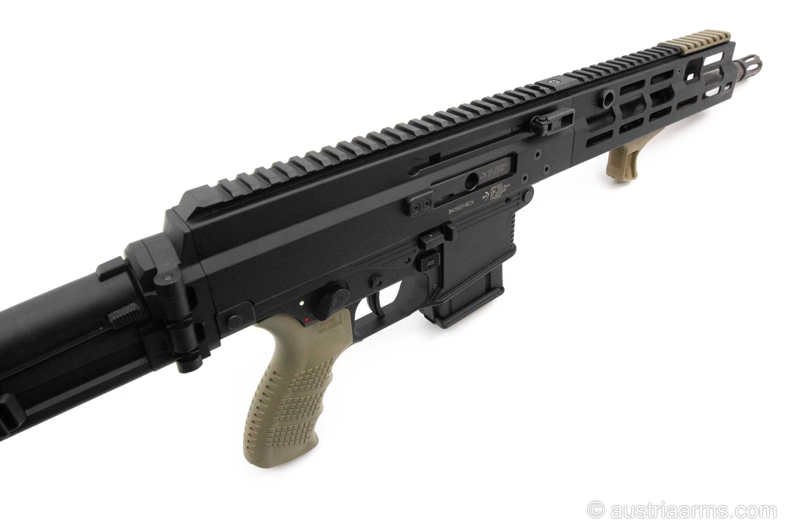 Zudem verfügt diese APC über einen 12″ Lauf mit Rotex-llA 2-Kammern Mündungsfeuerdämpfer mit SD-Aufnahme, einen vertikalen Sturmgriff, einen Klappschaft und einer klappbaren offenen Visierung.