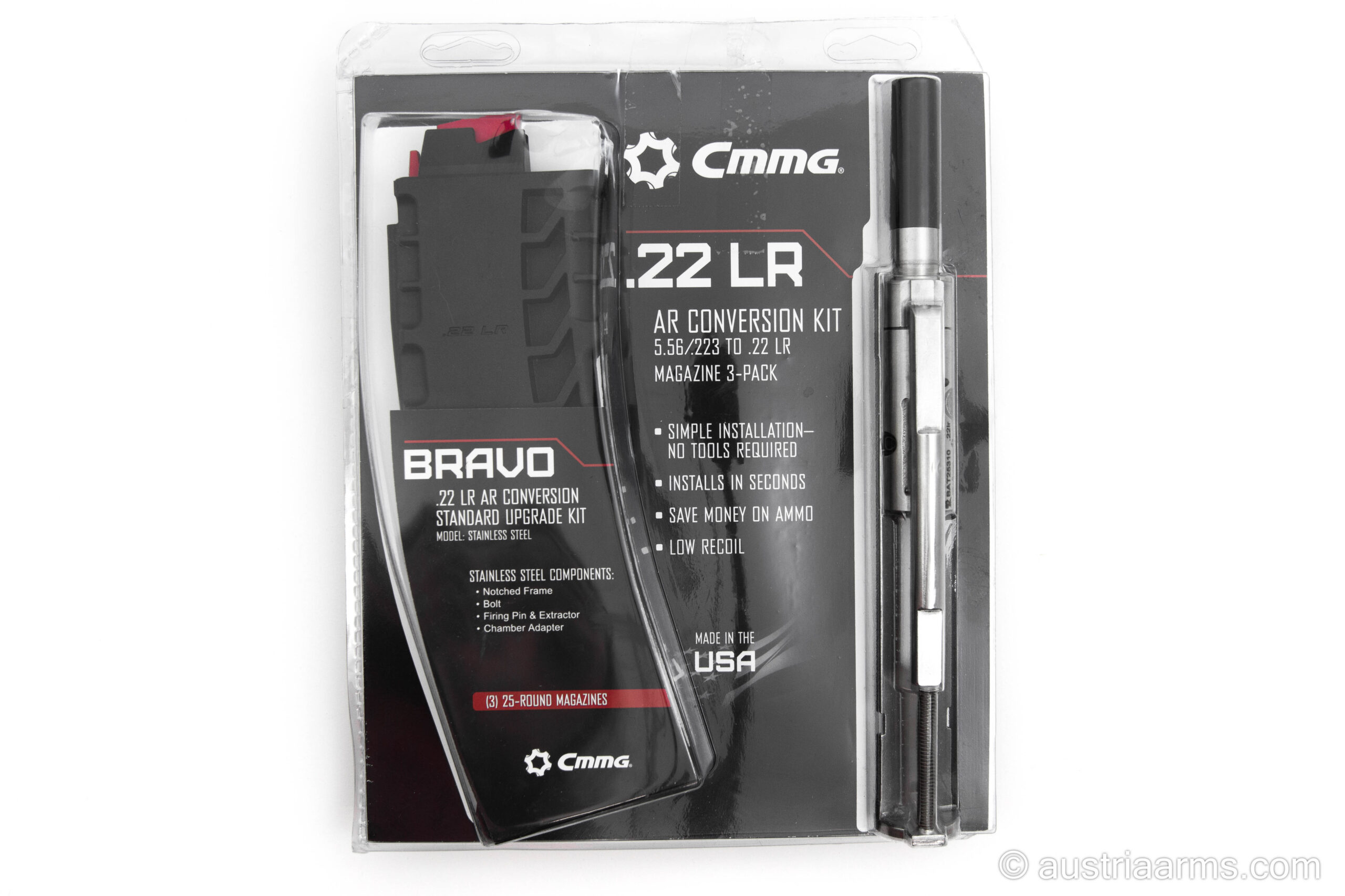 Dieses Drop-In Conversion-Set ist komplett montiert und sofort einsatzbereit – einfach Bolt-Carrier-Group austauschen, eines der drei im Lieferumfang enthaltenen 25-Schuss .22 LR Magazine einlegen und man ist bereit für Plinking, Trockenübungen oder Trainingseinheiten mit günstiger Randfeuer-Munition.