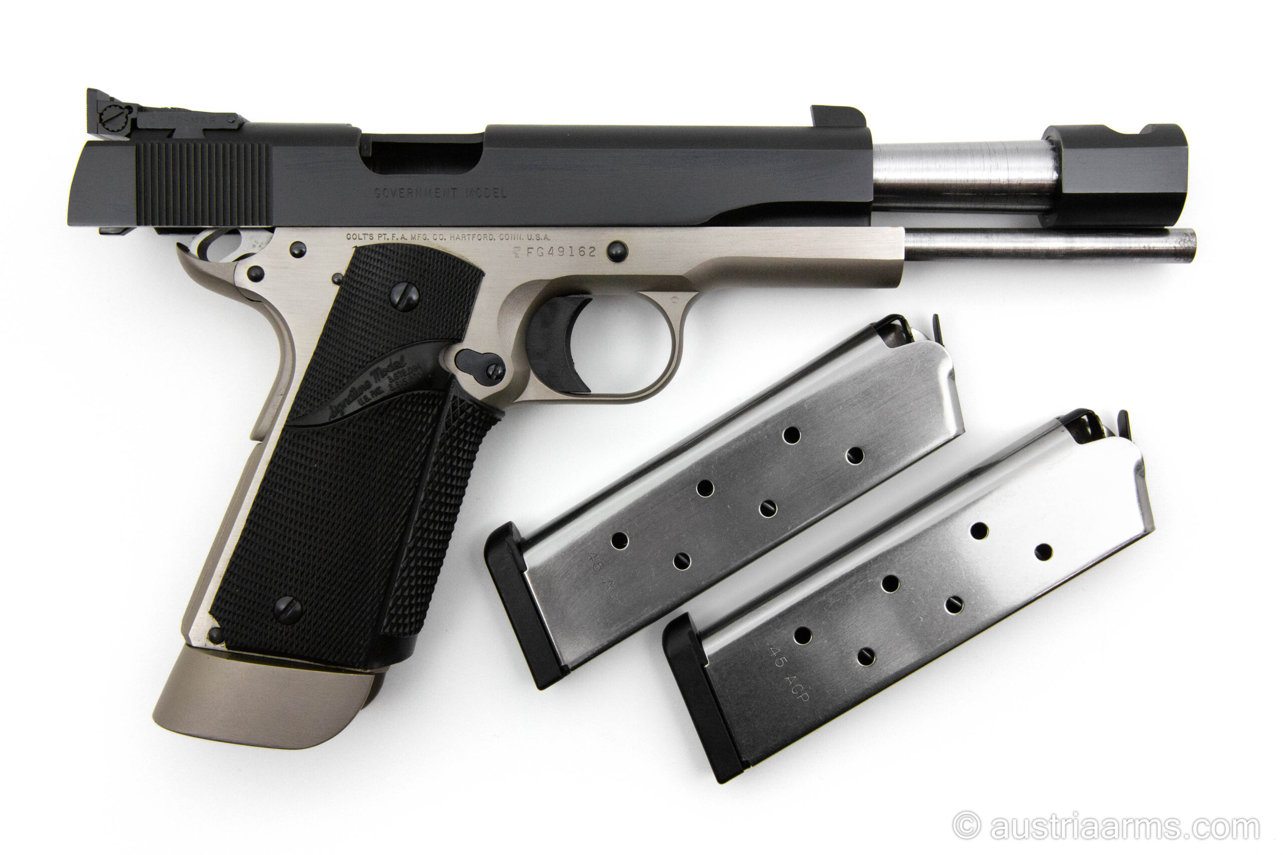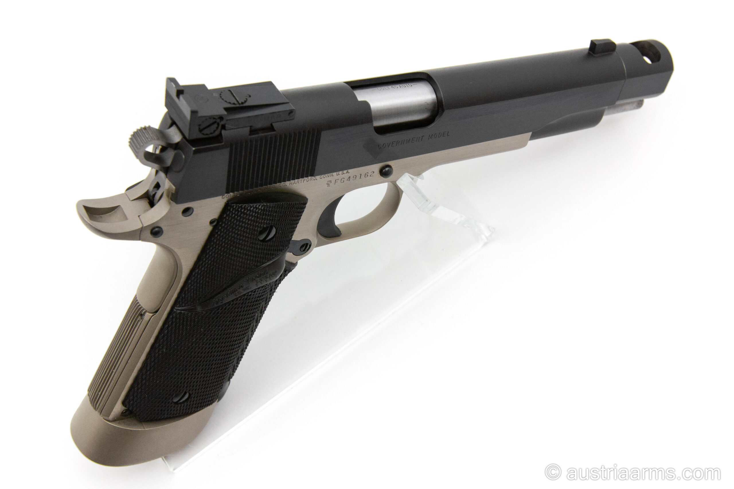 Auf Basis einer 5.0 Zoll Colt Gov. MK IV / Series 80 wurde von kundiger Hand eine Customwaffe auf sehr hohem Niveau geschaffen. Matchgrade Abzug, skelletierter Hammer, Kompensator, Bo-Mar Match Kimme. Wunderschönes Two Tone Finish Silber-Schwarz. Pachmayr Gummi-Griffschalen. Ein Spitzengerät zum überschaubaren Preis – klare Kaufempfehlung !