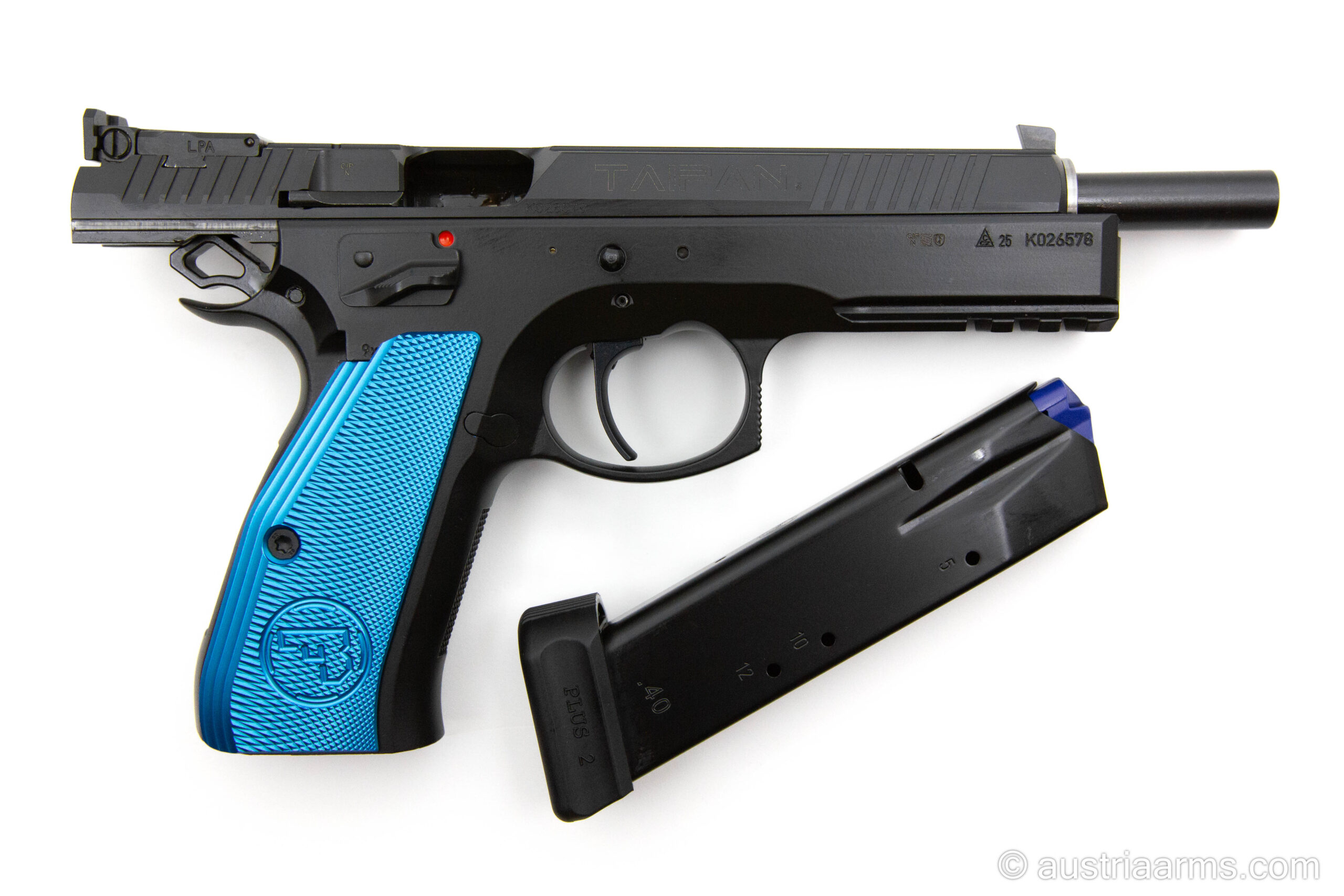 Die Taipan Blue kommt mit einem 19-Schuss-Magazin und 2 Reservemagazinen, einem 6-Zoll-Lauf (153 mm) und einer Visierlänge von 206 mm. Der Magazinauslöseknopf kann auf Linkshandbetrieb umgebaut werden. Das Gesamtgewicht – inklusive leerem Magazin – beläuft sich auf 1.290 g. Diese erstklassige Sportpistole wird mit einem LPA TRT-Visier, einem fein überarbeiteten Single-Action-Only-Abzug (SAO) mit geradem Alu-Abzugszüngel, einem abgestimmten Single-Action-Only-Hammer und Alu-Griffschalen mit scharfem Checkering  ausgeliefert.