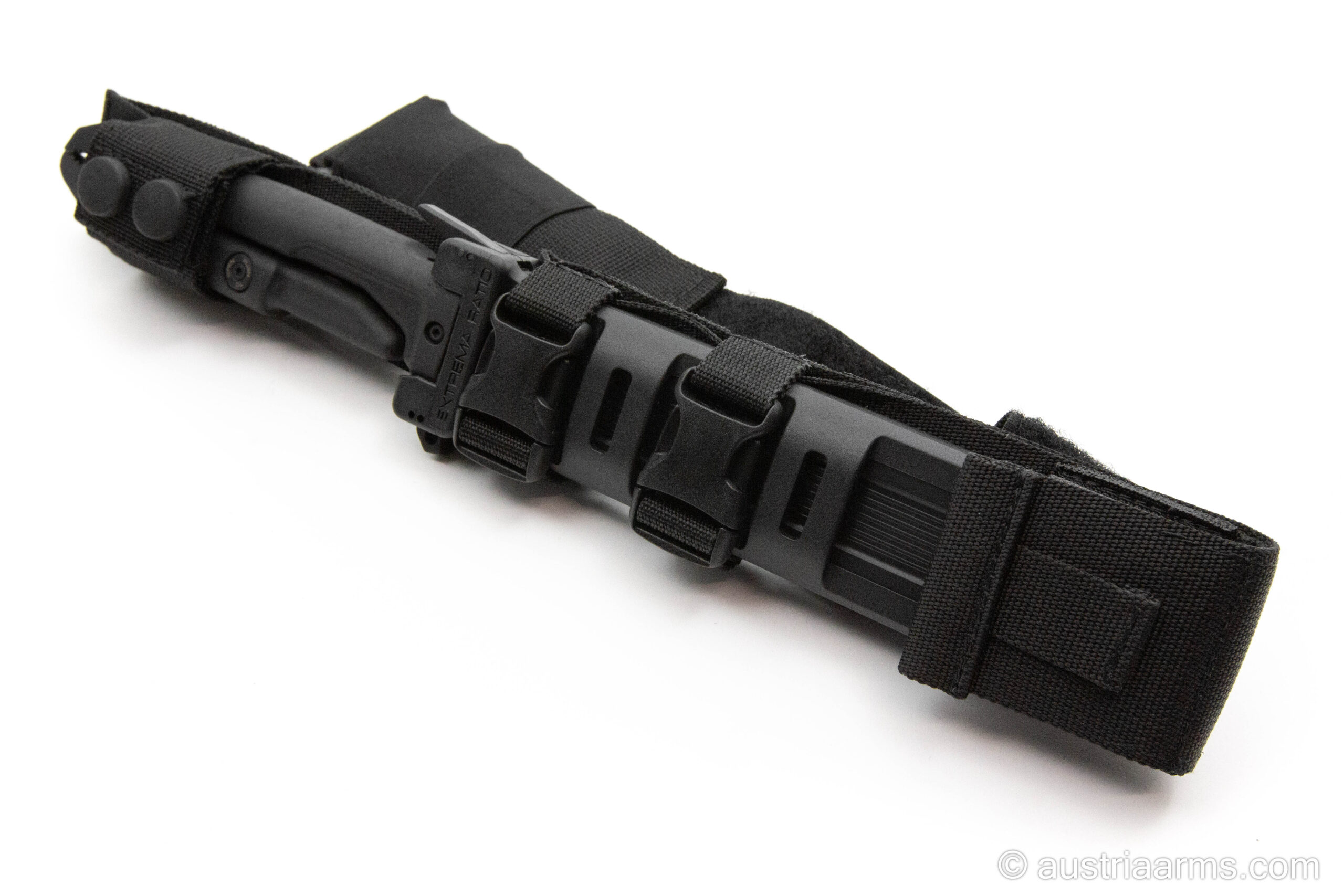 Das Messer wird mit einer sicheren Scheide geliefert, die während der Nutzung als Schutz dient und gleichzeitig einen schnellen, stillen Zugriff über ein Retentionssystem ermöglicht. Die Scheide ist so konzipiert, dass sie entweder am Oberschenkel oder über ein M.O.L.L.E-System am taktischen Gear montiert werden kann und so platzsparend in jeder Ausrüstung integriert werden kann.