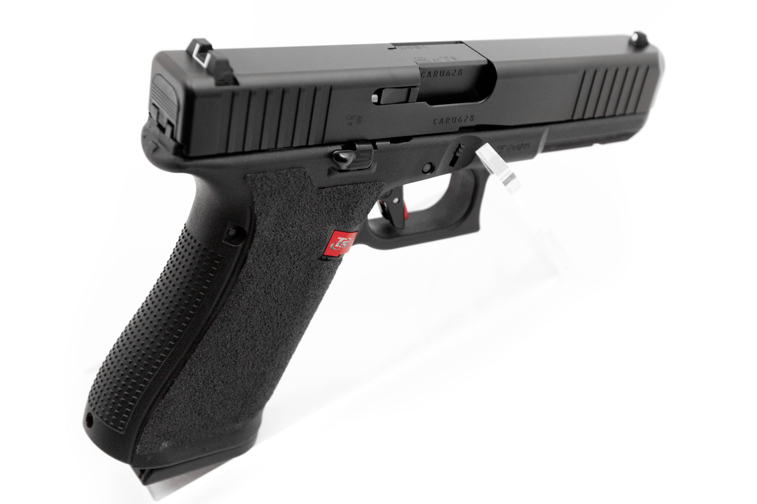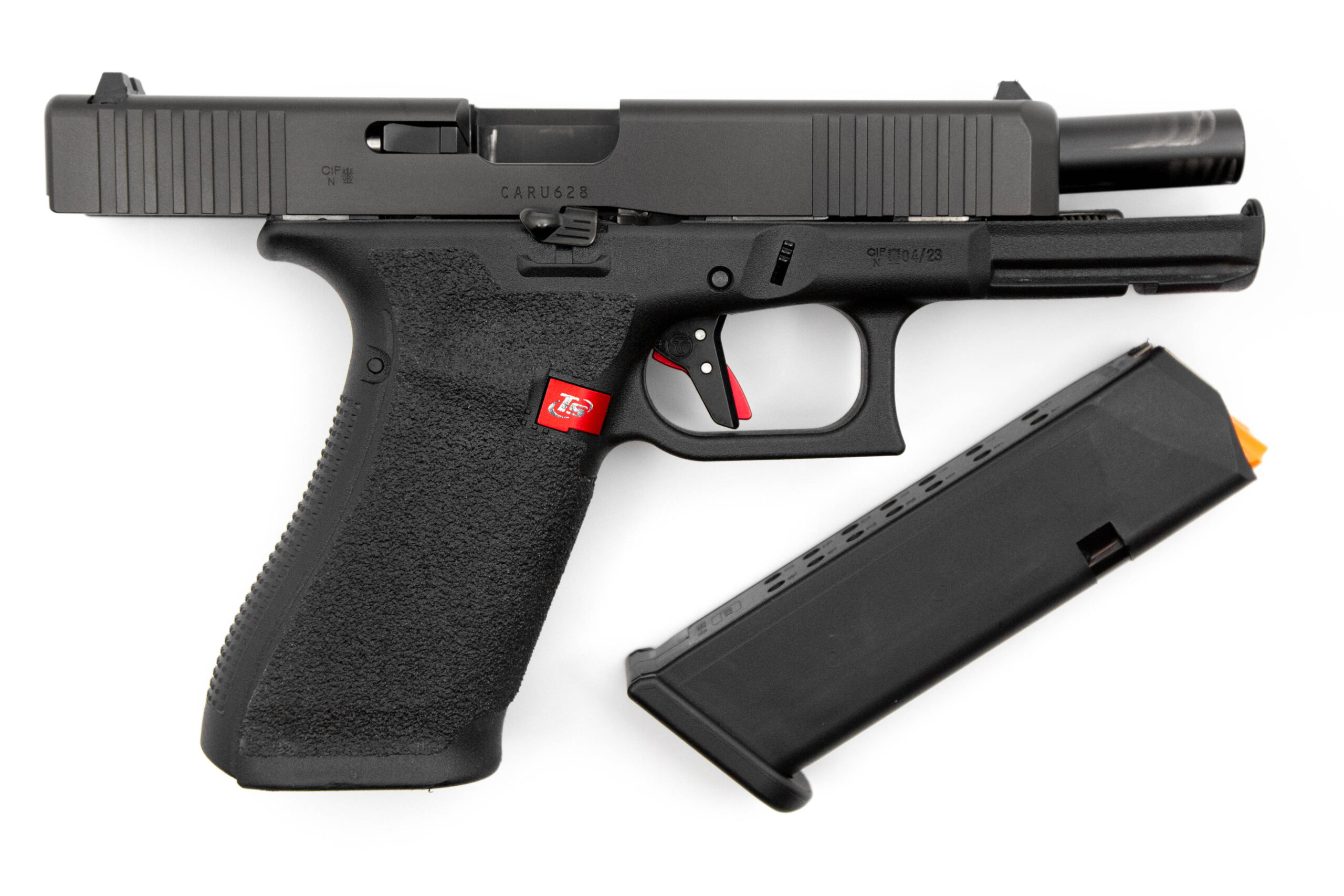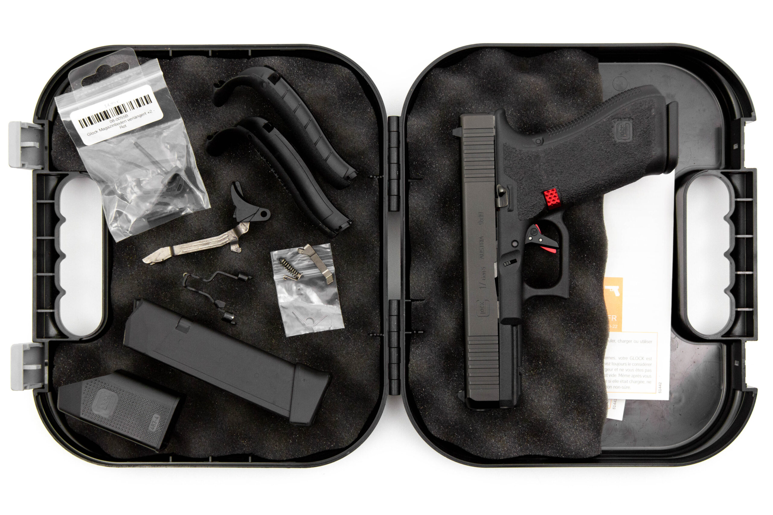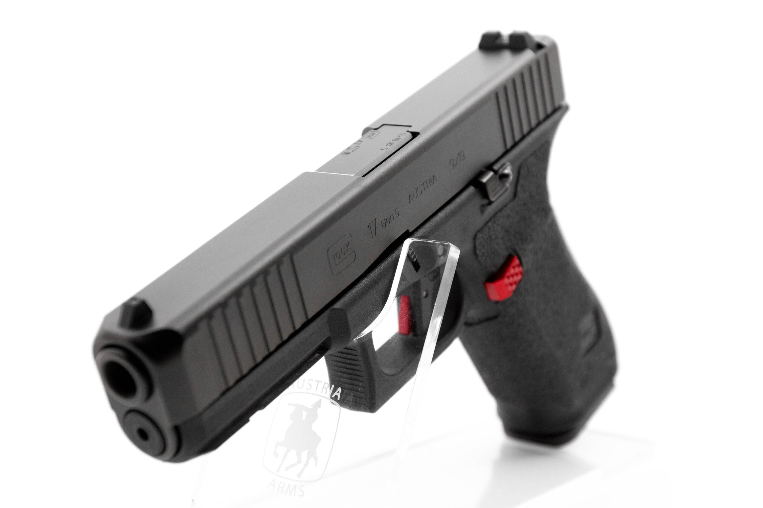 Diese Glock 17 Generation 5 wurde von ihrem Vorbesitzer voll ausgestattet, jedoch kaum geschossen: neuwertiger Zustand. Komplett i der Originalbox mit einem Reservemagazin. Rot eloxierter Magazinhalter aus Hochleistungs-Aluminium. Timney Matchabzug mit roter Abzugssicherung. Perfekter Grip durch ein Skateboard Tape am Griffstück.