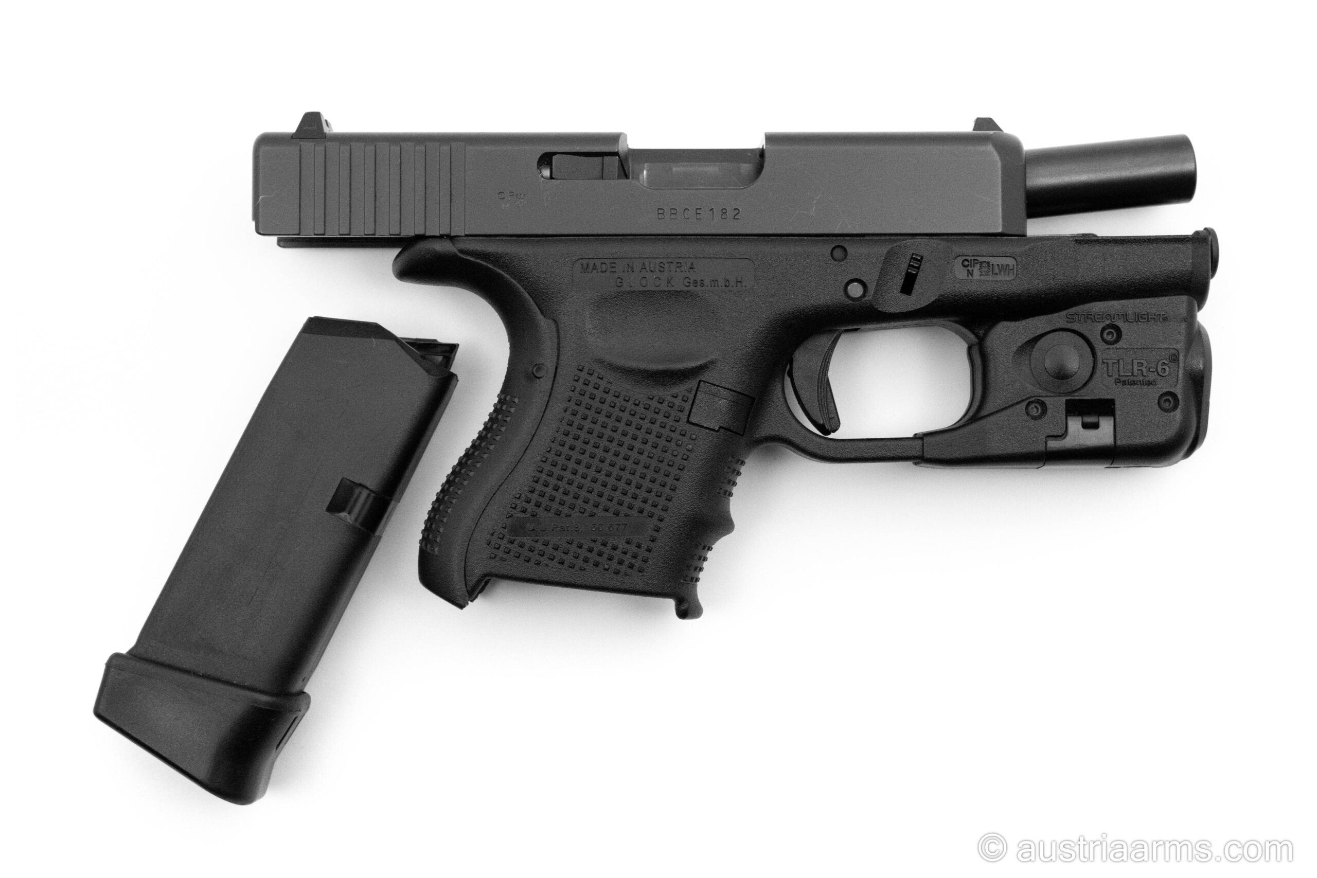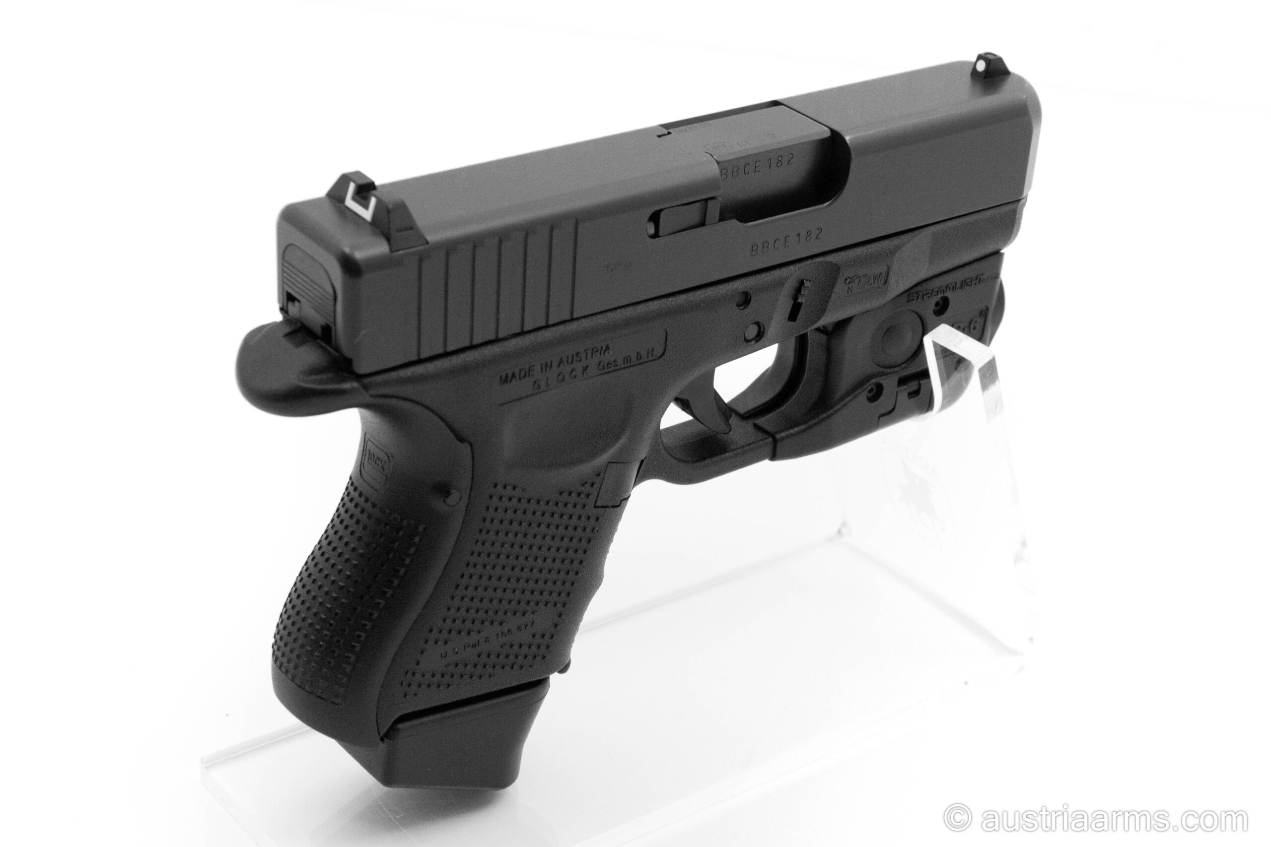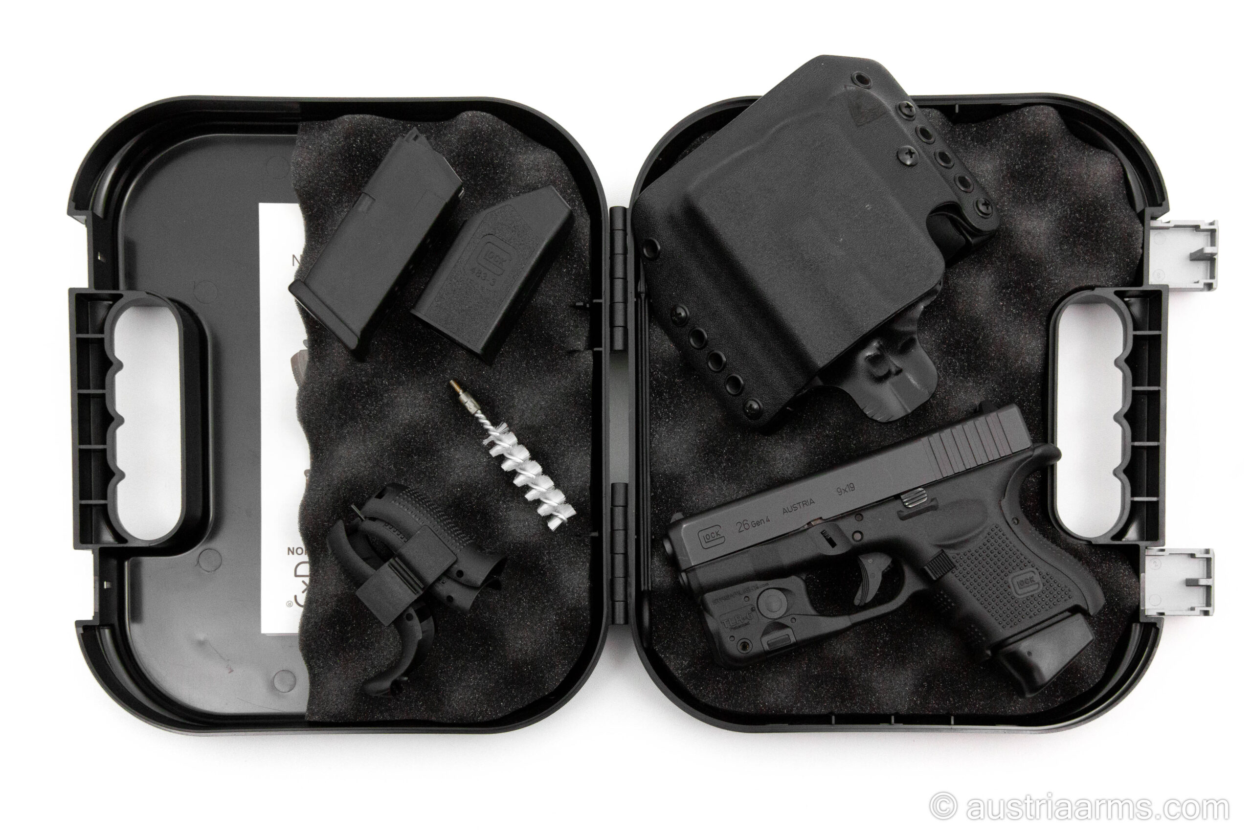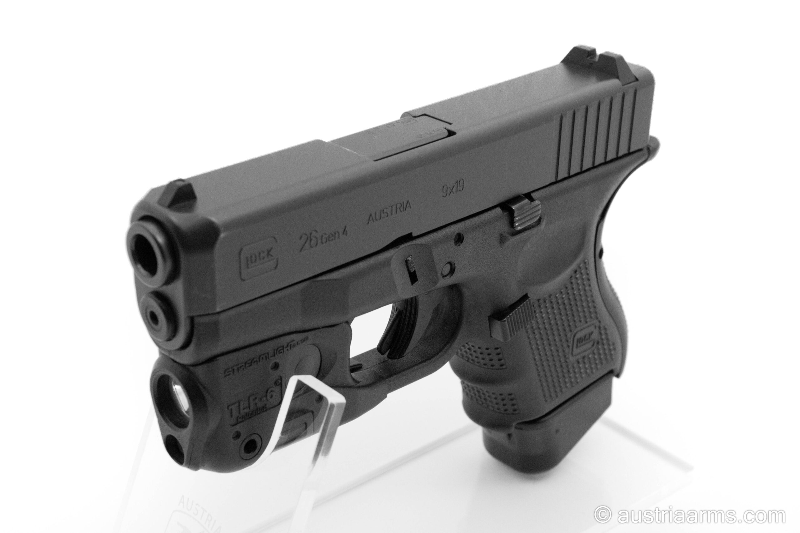 Neuwertige Glock 26 Gen4 mit dem qualitativ erstklassigen Behörden-Lichtlaser Modul Streamlight TLR6 und einem flachen Kydex Gürtelholster (passend für Waffe und Licht/Laser). Kaum geschossene Waffe aus gepflegtem Vorbesitz, komplett mit der Original Glock-Box und einem Reservmagazin.
