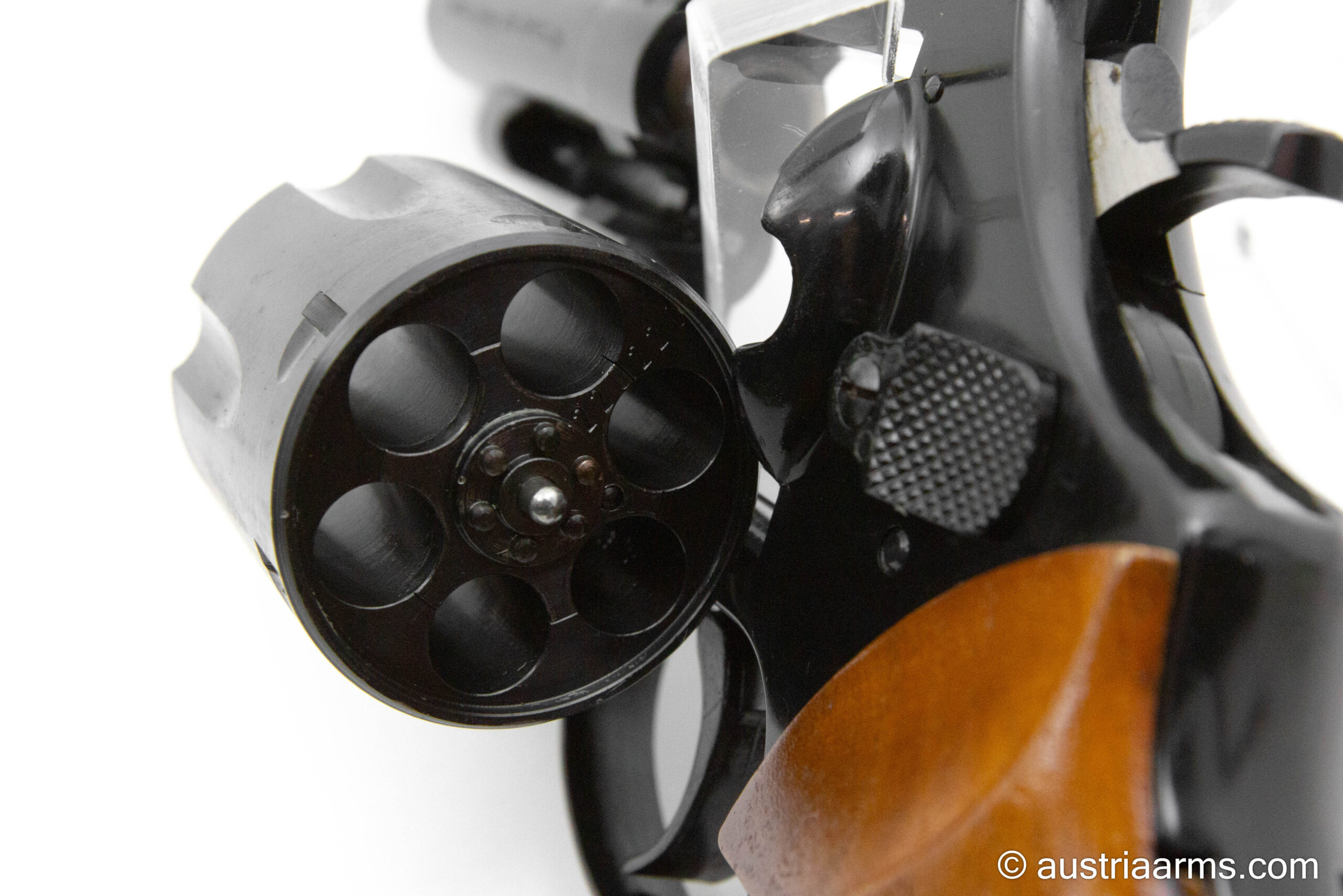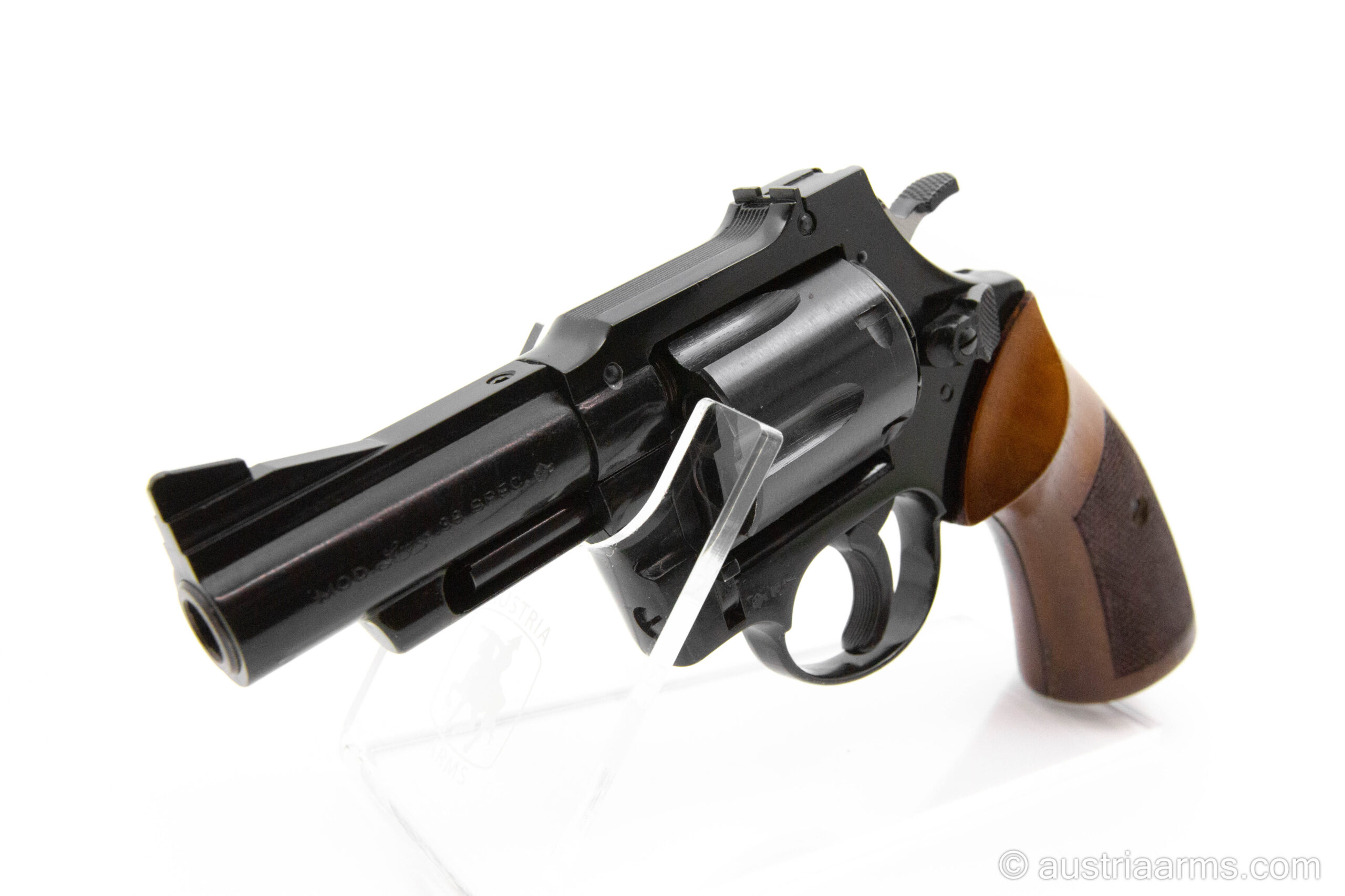Preiswerter Revolver aus deutscher Fertigung mit 3.5″ Lauflänge, attraktiver Holzgriff, 6 Patronen Trommelkapazität, Kaliber .38 Special. Diese Waffe war offensichtlich eine Schrankwaffe und befindet in neuwertigem, ungeschossenen Zustand.