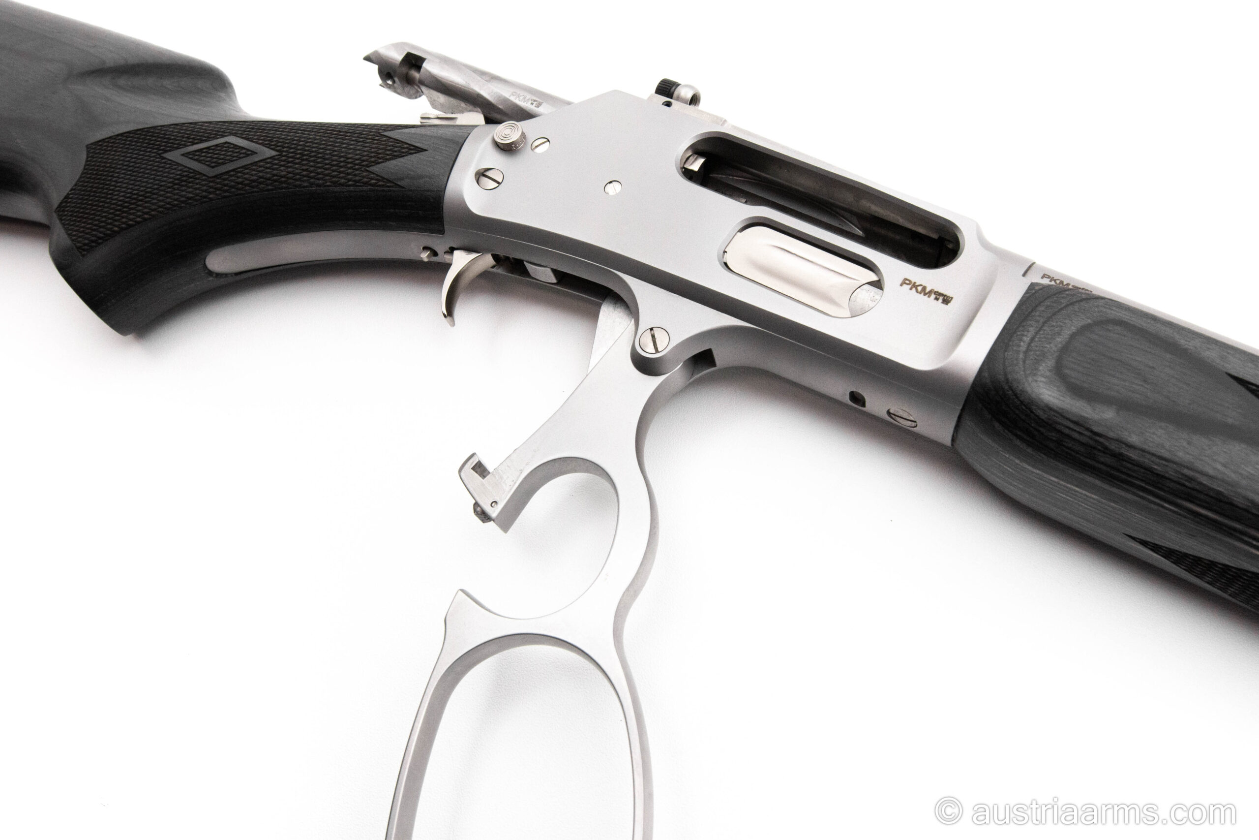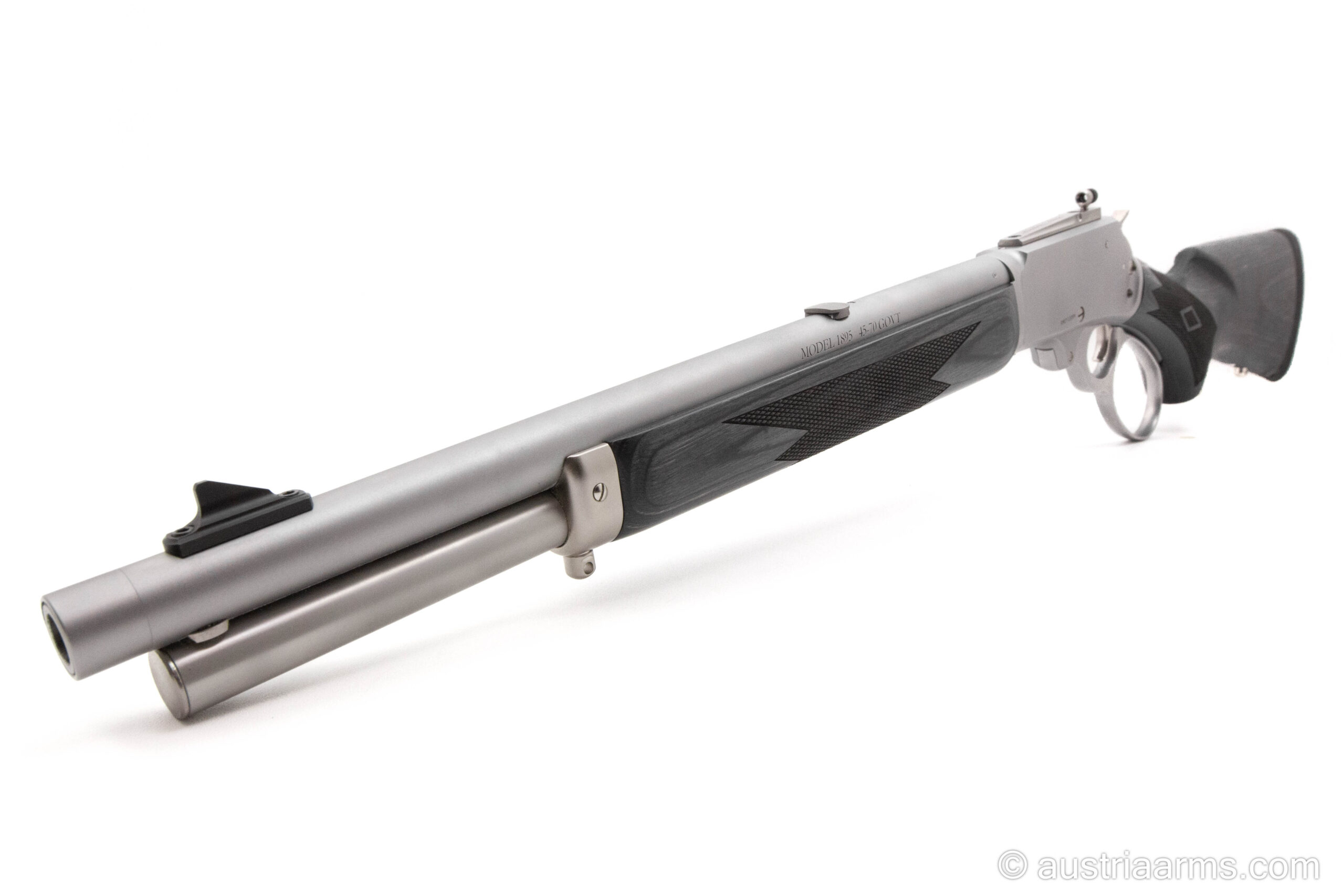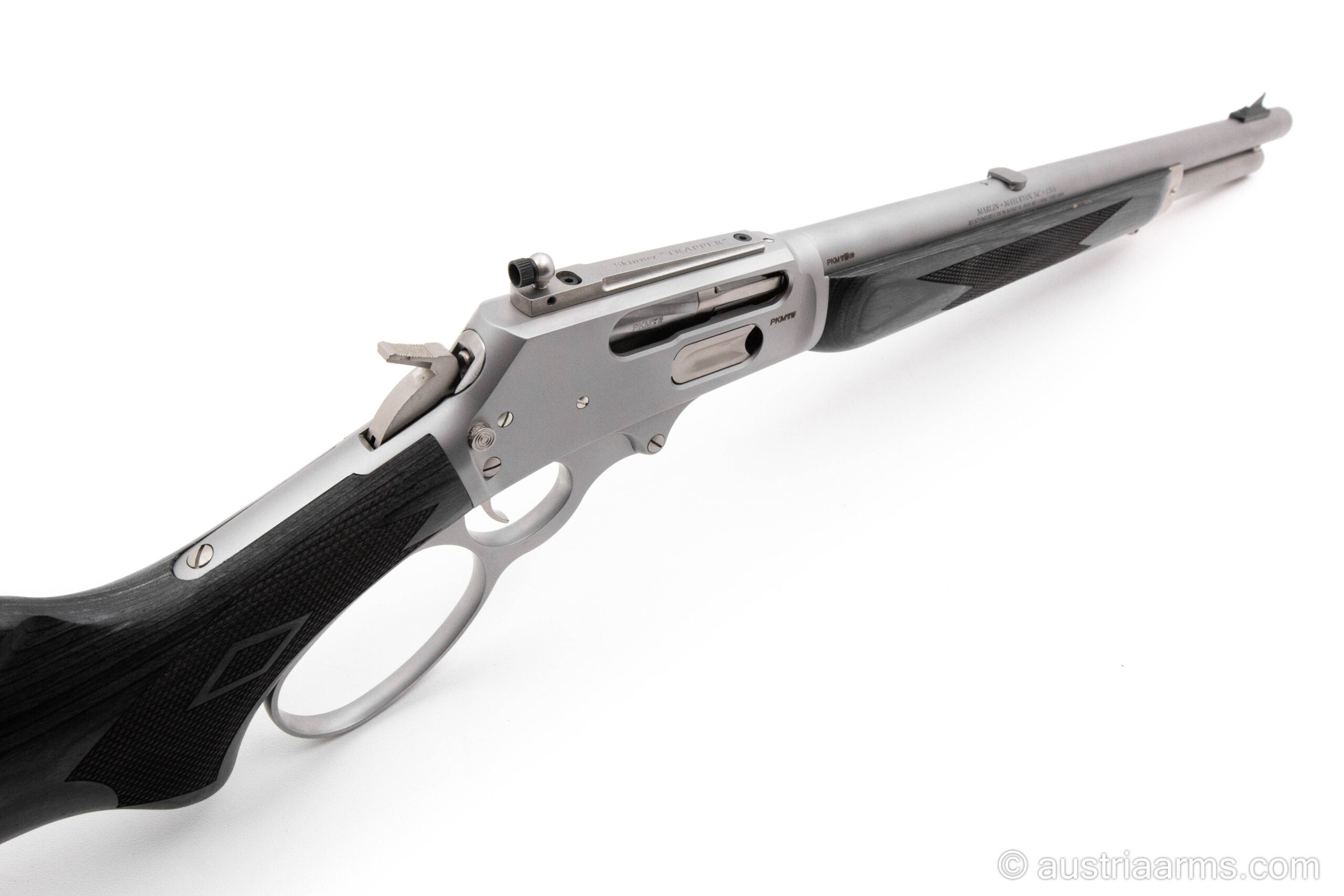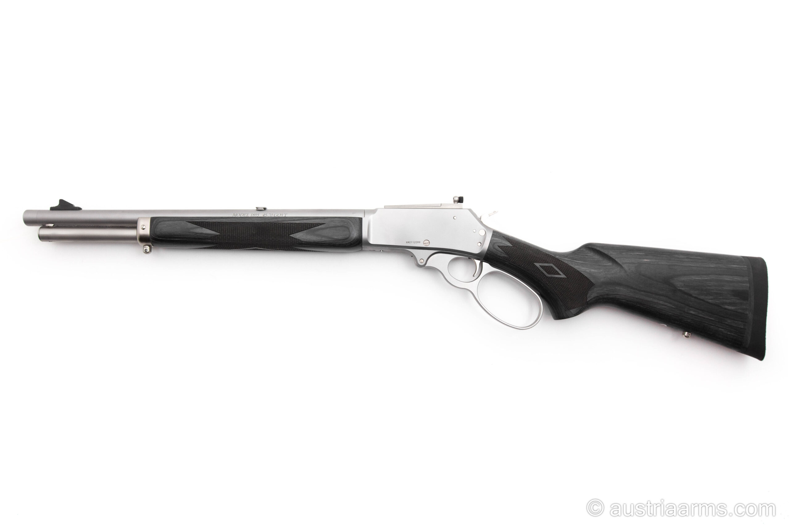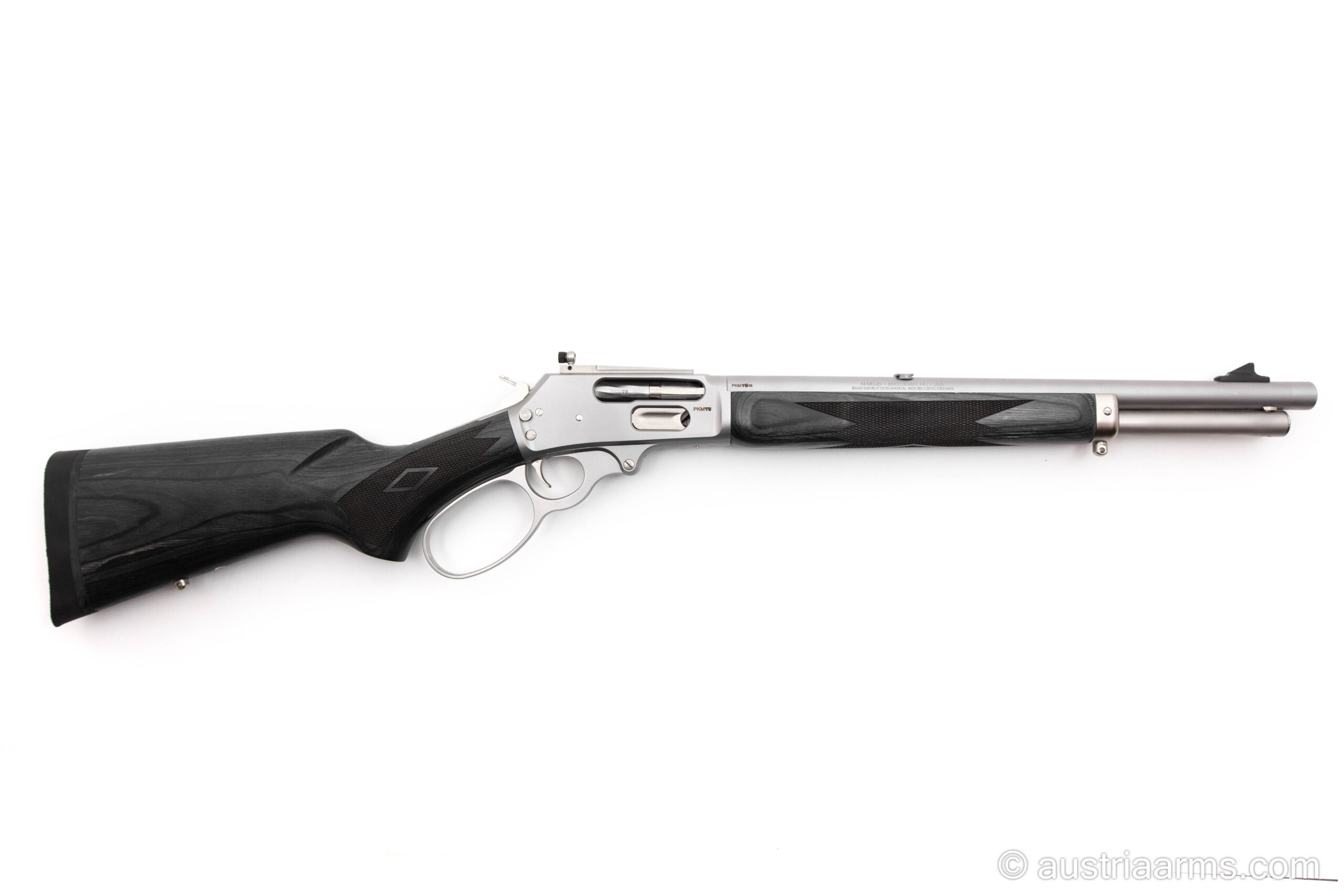 Klassische Marlin Unterhebel-Repetierbüchse in Stainless Stahl Ausführung mit amerikanischem Schichtholzschaft. Sehr kompaktes, führiges Gewehr, Gesamtlänge 96 cm. Kaliber .45/70 Government – ein überzeugendes Argument.