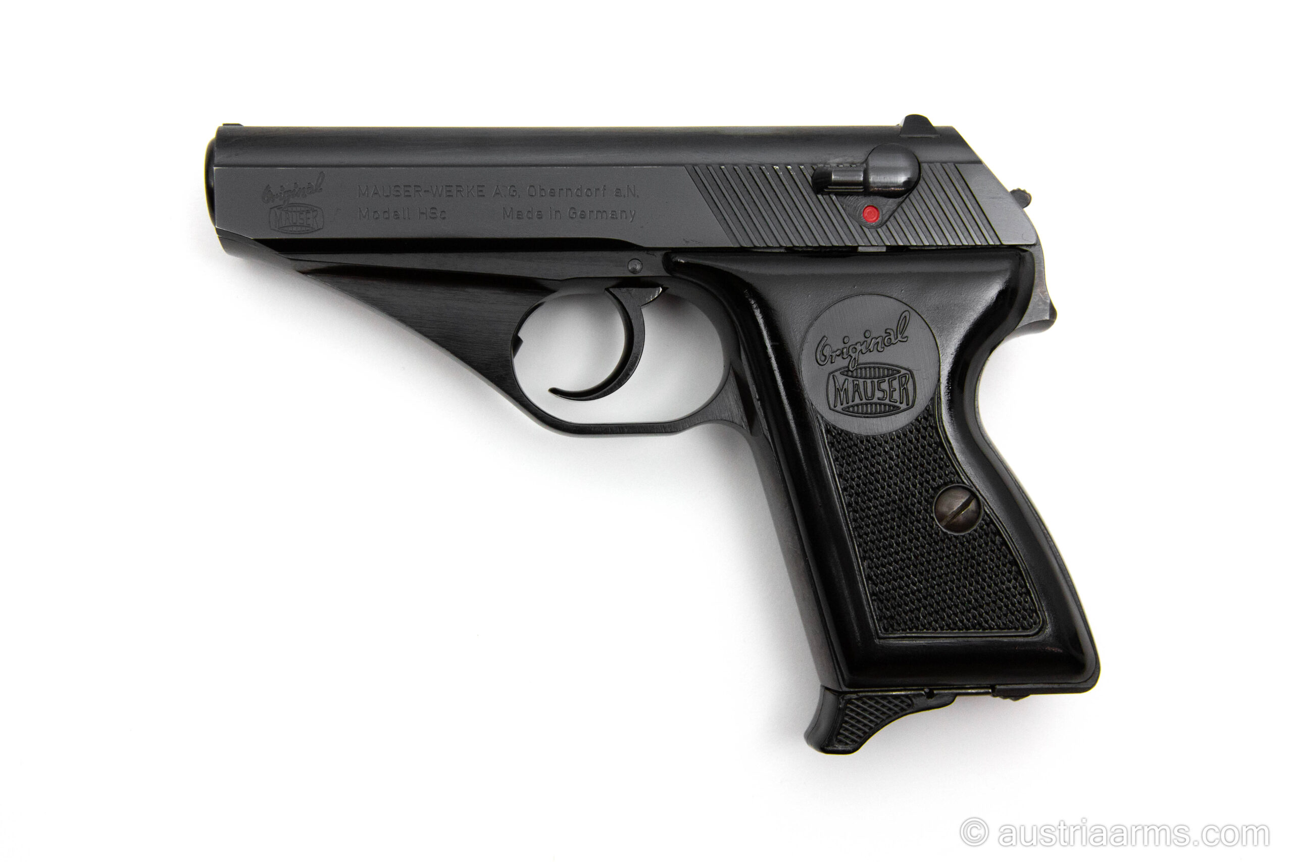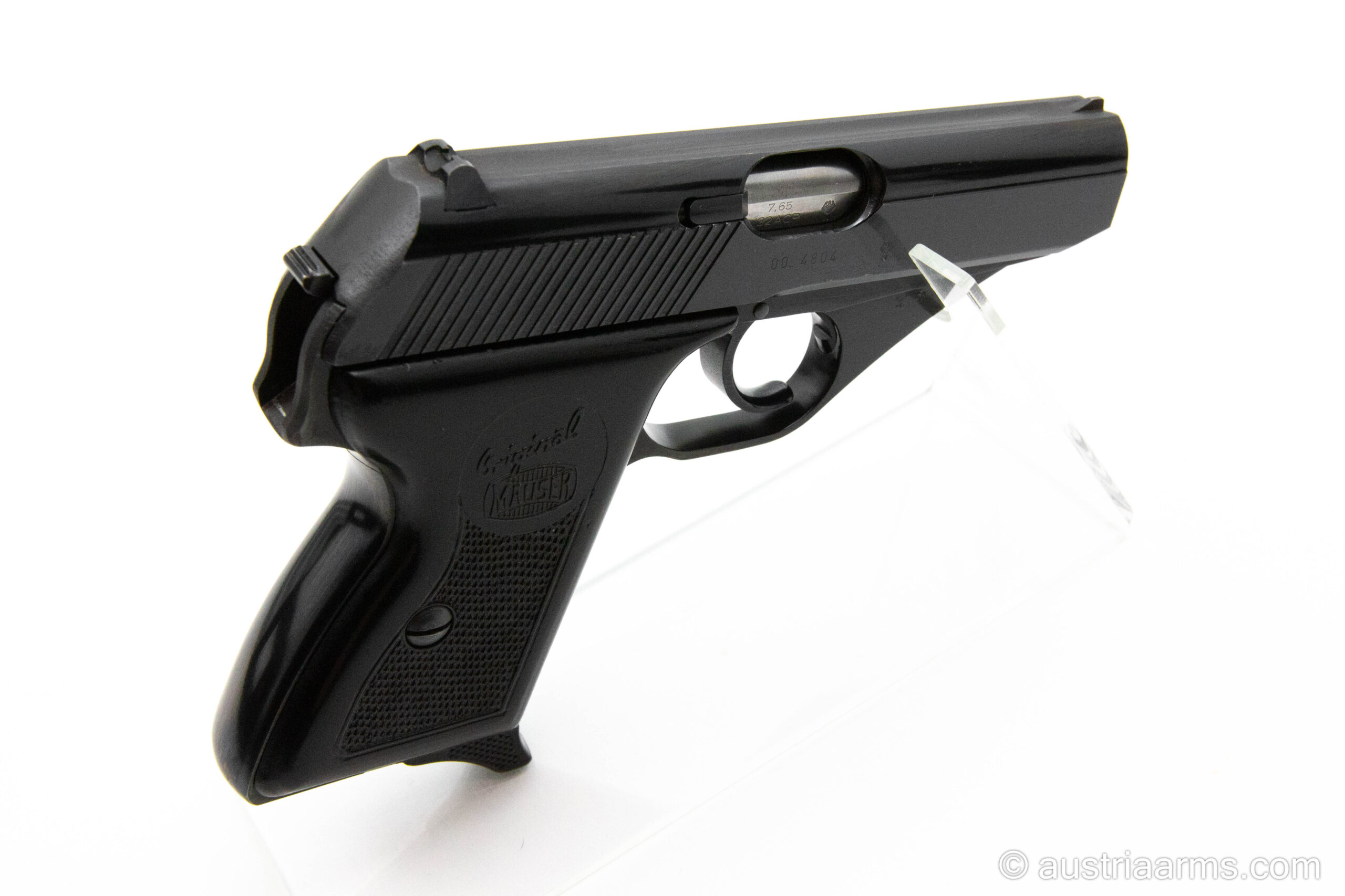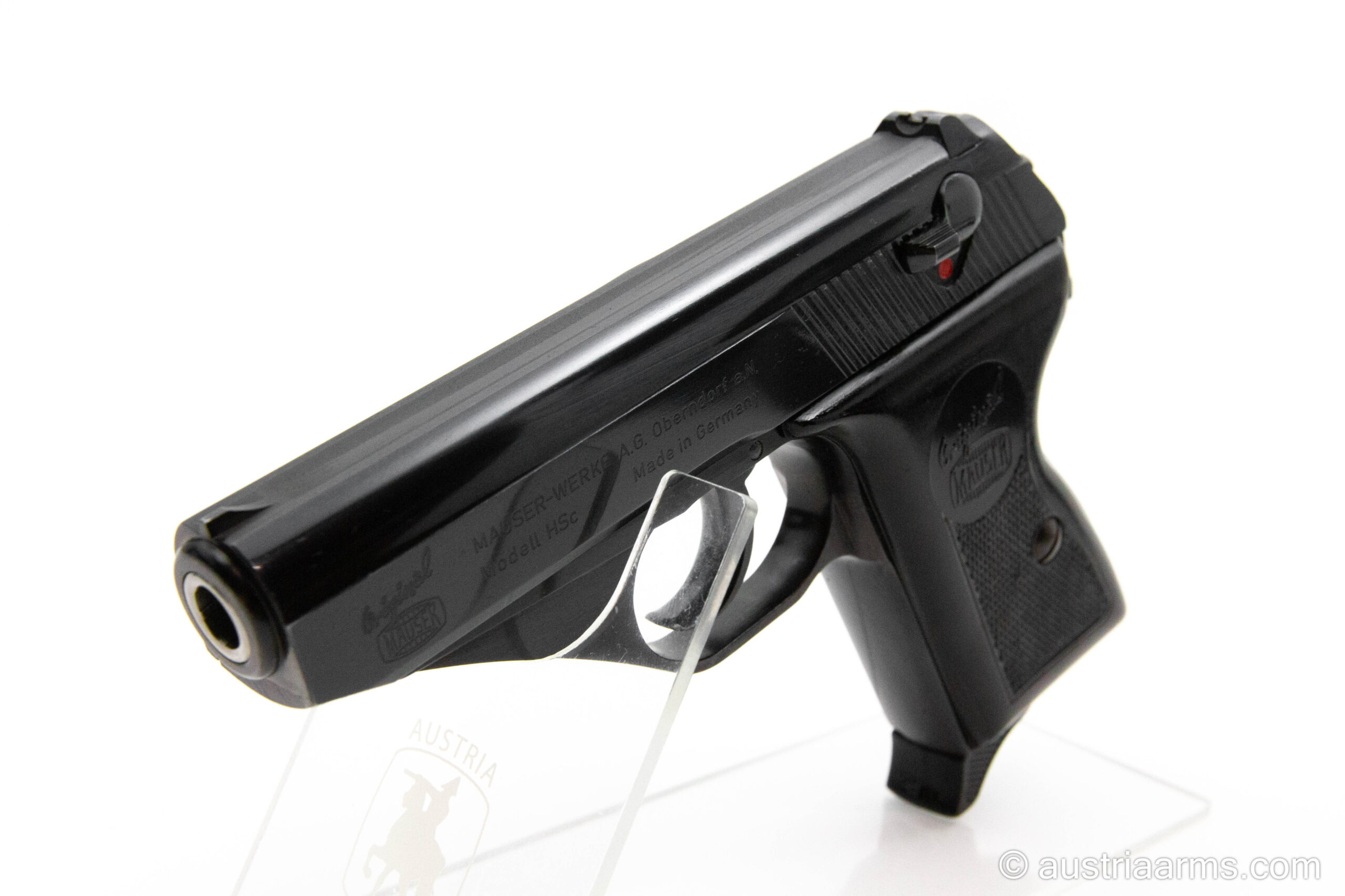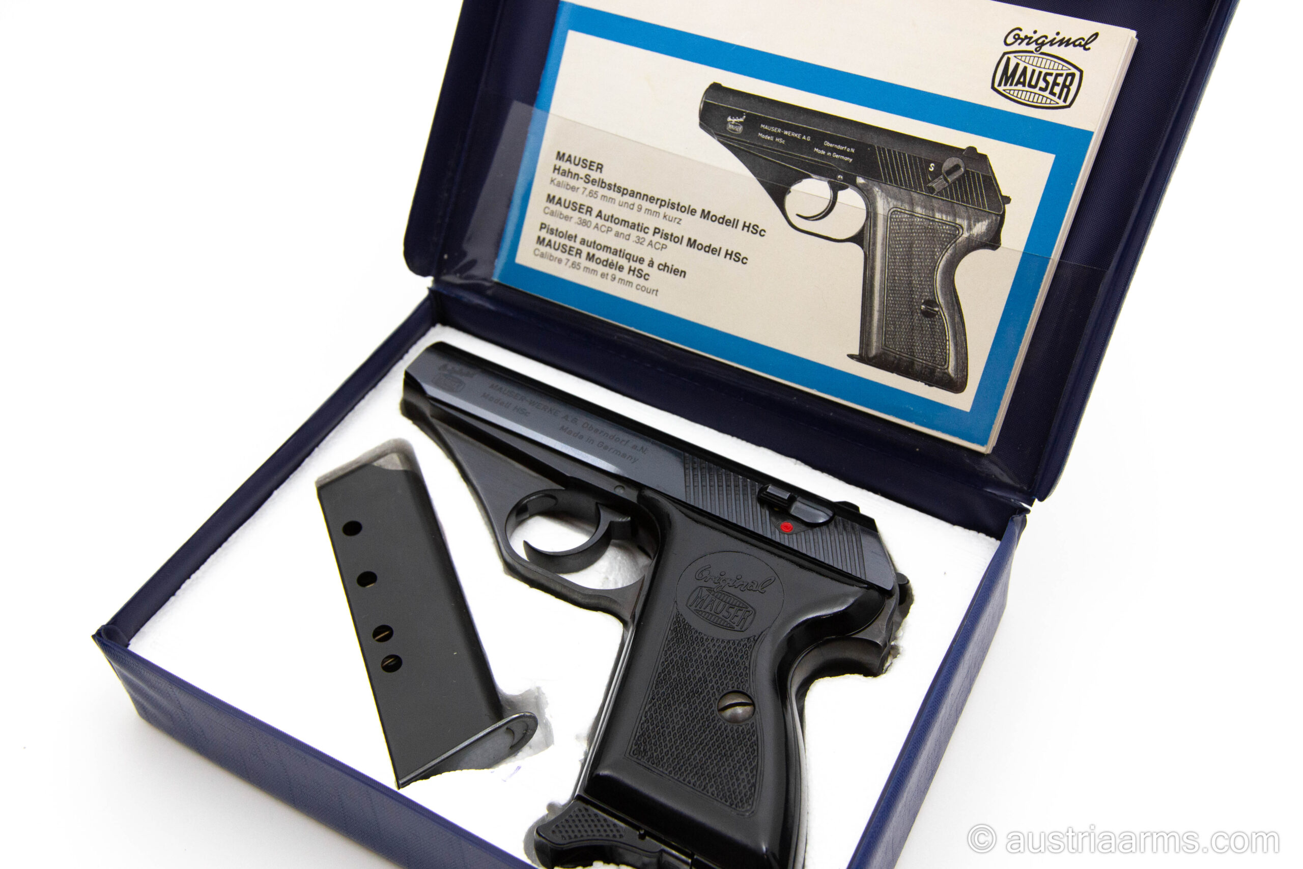 Nachkriegsfertigung der legendären Mauser HSC, Herstellungsjahr 1969. Wunderschönes Exemplar in der unbeschädigten Originalbox mit einem Reservemagazin. Die Mauser HSC war eine der besten 7,65 mm Pistolen ihrer Zeit. Leider zu teuer – deshalb kamen, verglichen zur Walther PPK, nur geringe Stückzahlen auf den Markt. Bei dieser Waffe handelt es sich offenbar um eine Tresorwaffe: gekauft, dann jahrzehntelang in einem Tresor eingesperrt. An der Waffe sind keine Tragespuren oder Markierungen einer Schussbelastung ersichtlich.