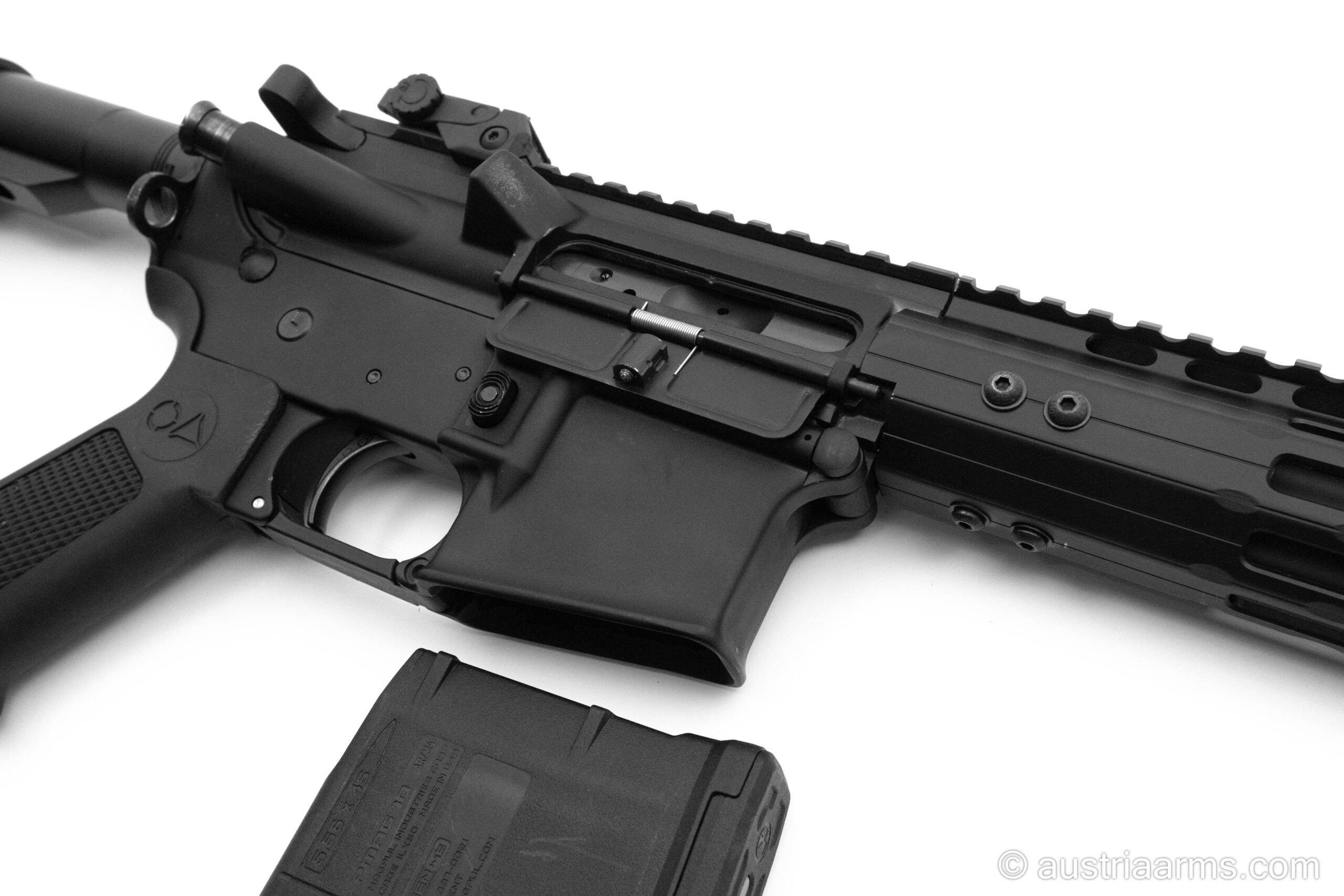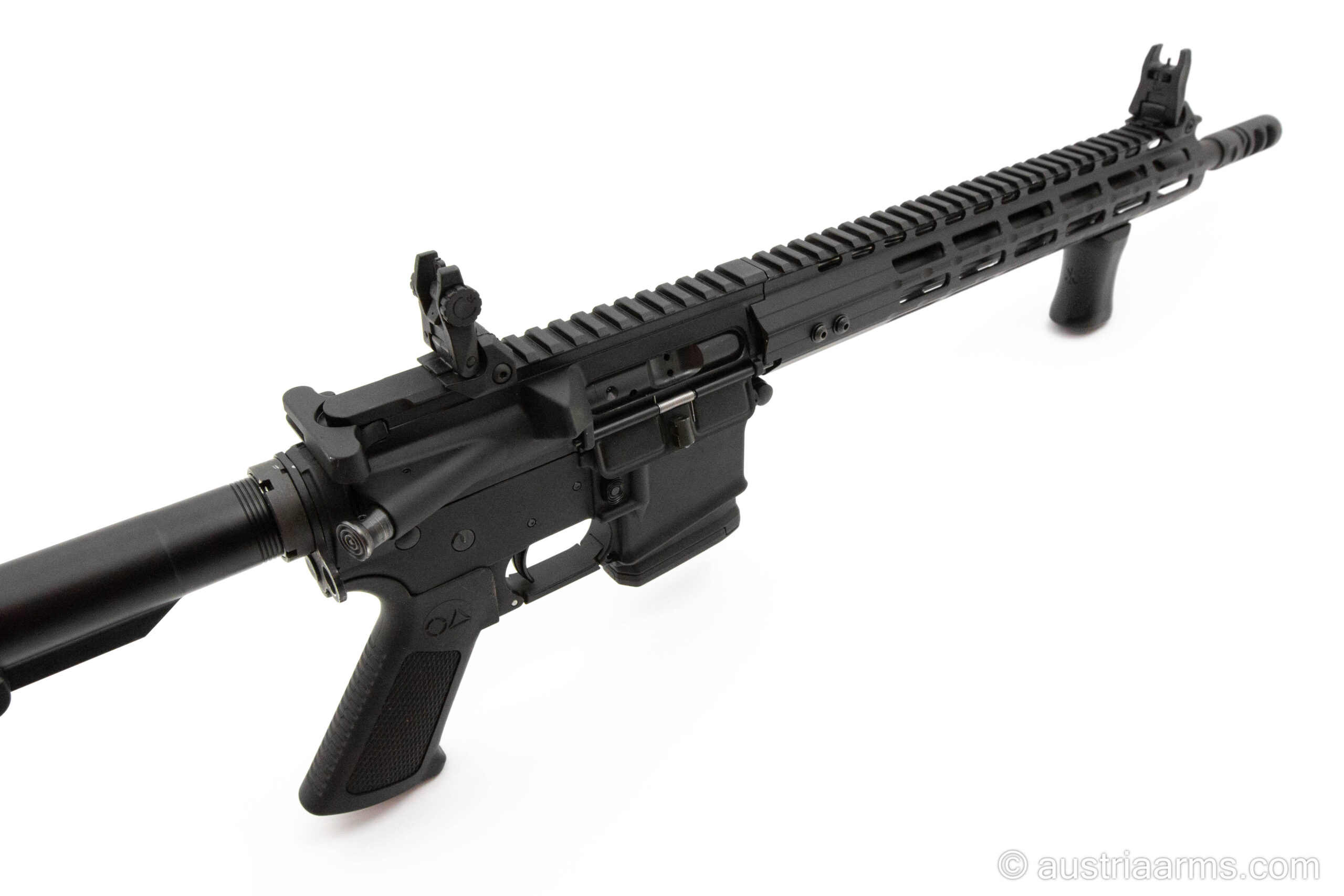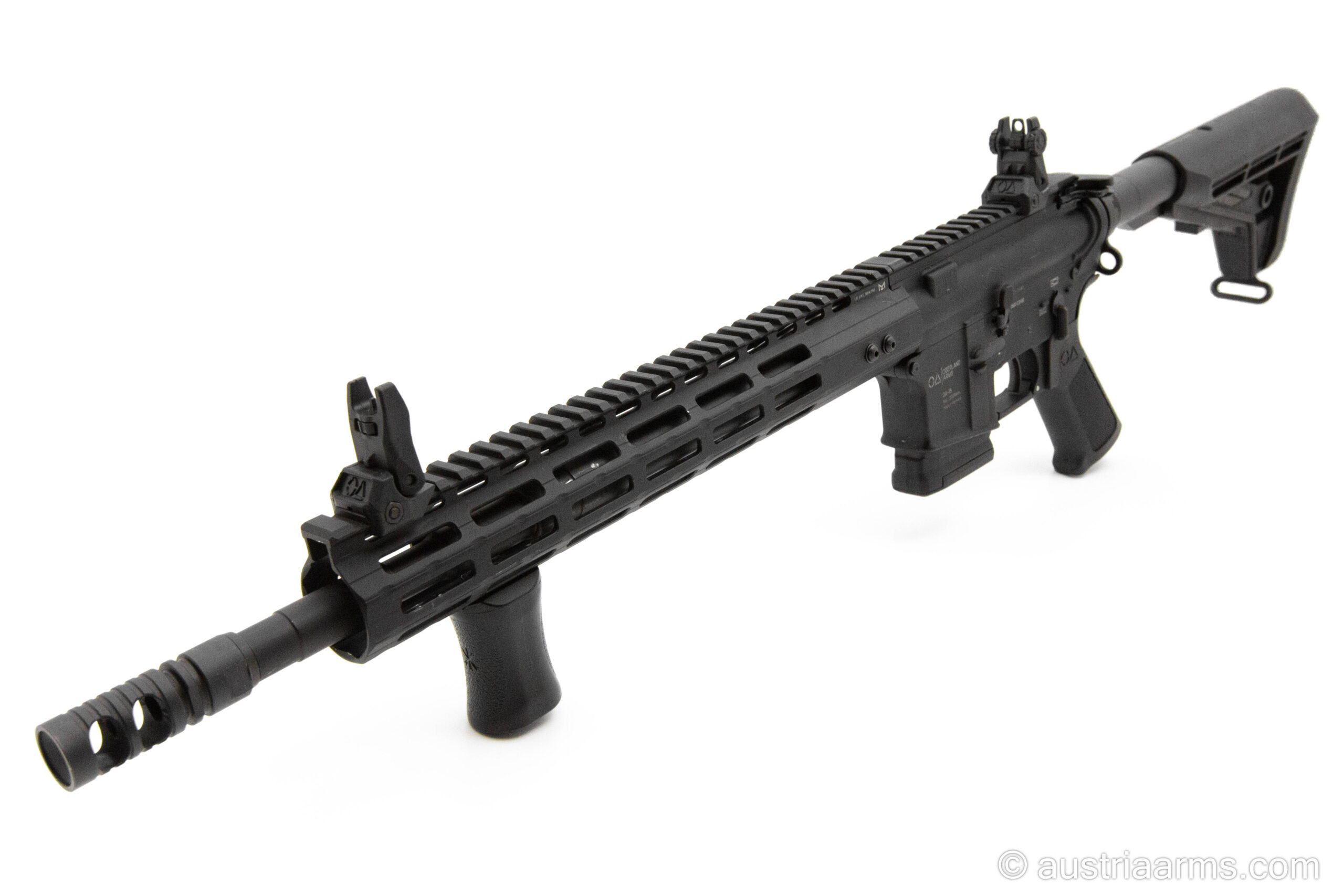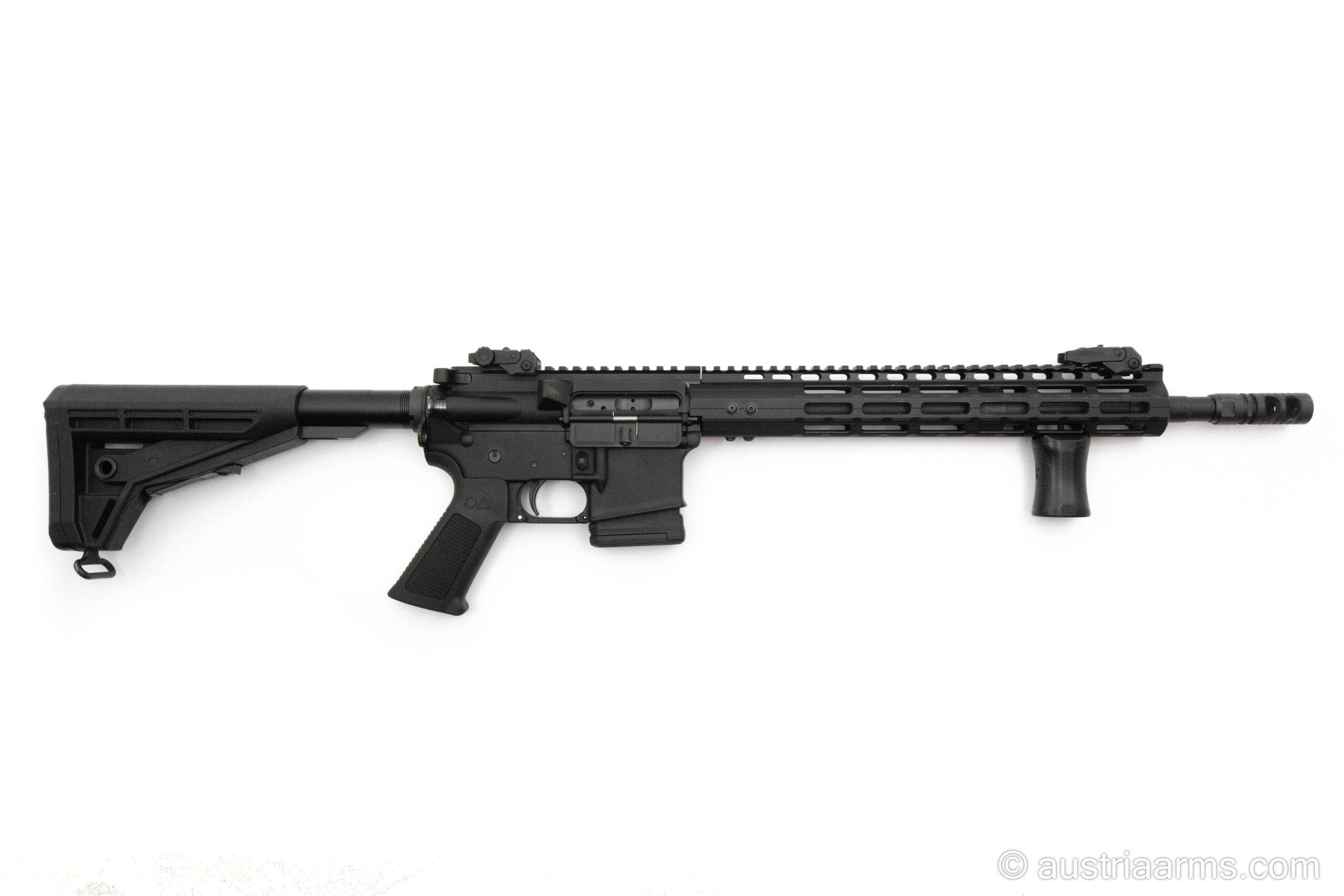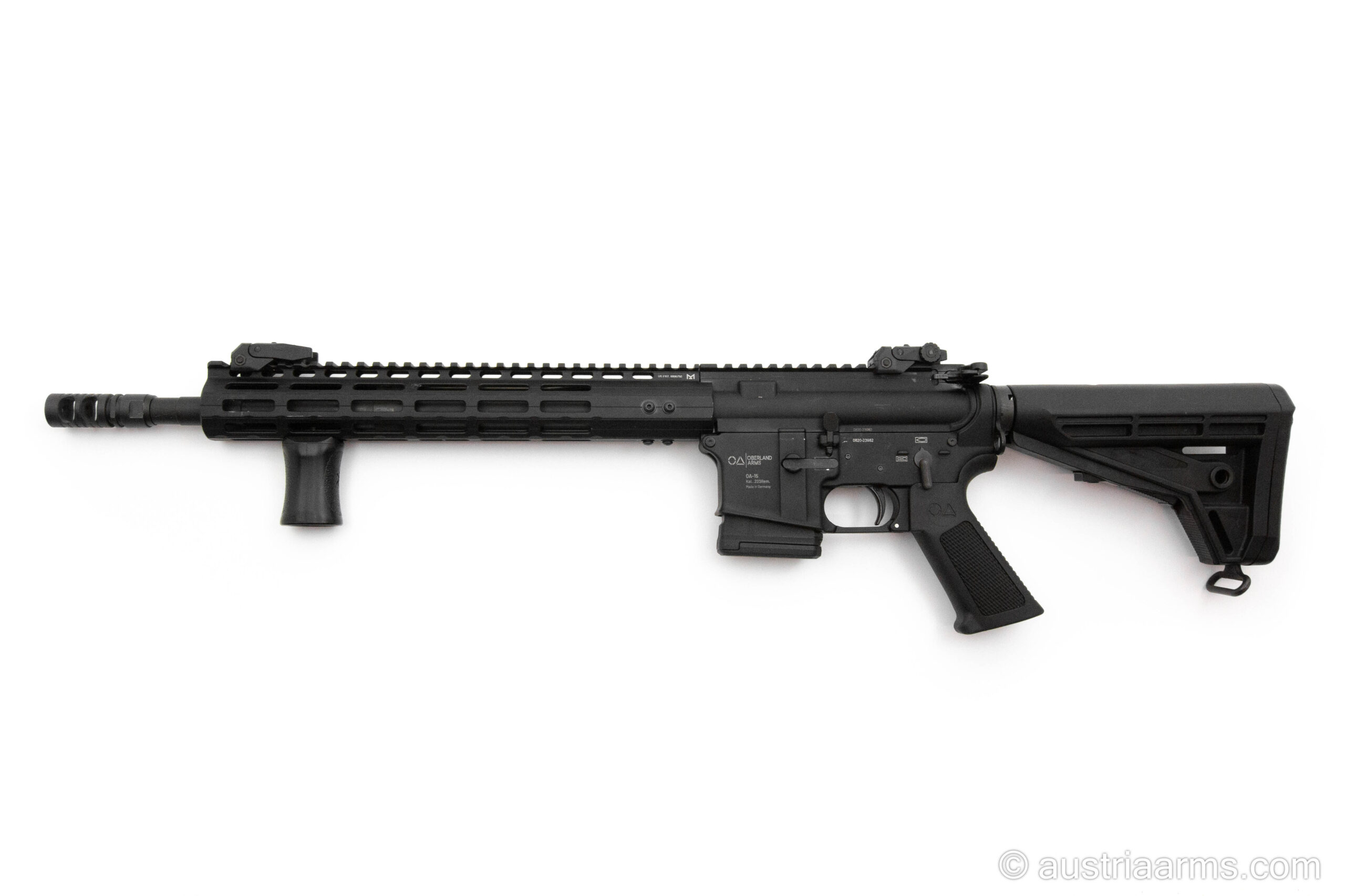 Gebrauchtwaffe in Neuzustand: Oberland Arms OA15 mit 14,5 Zoll Lauflänge. Im Paket inkludiert ist Geissele Matchabzug, eine 2-Kammern Mündungsbremse, Flip Up Sights und ein Vordergriff.