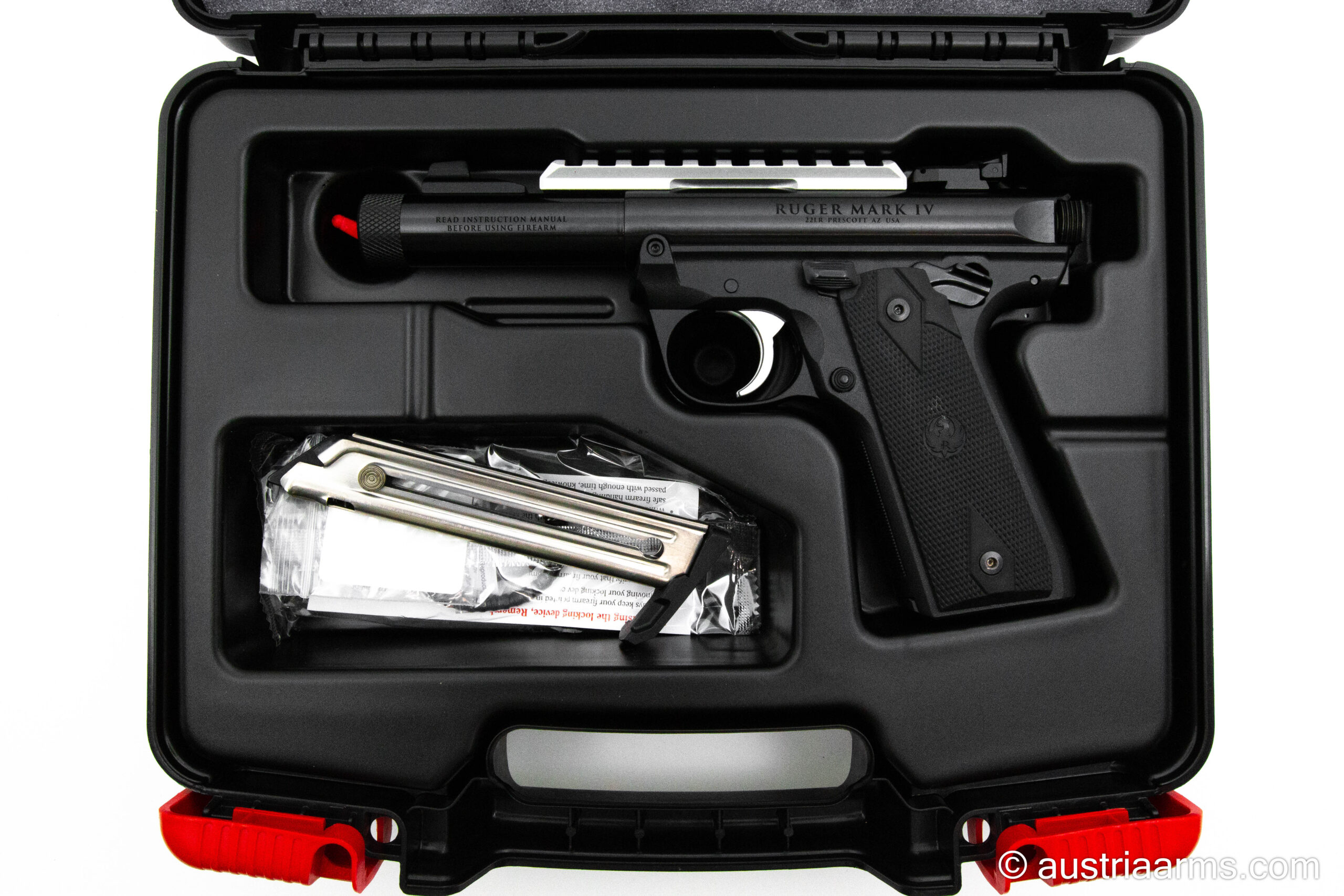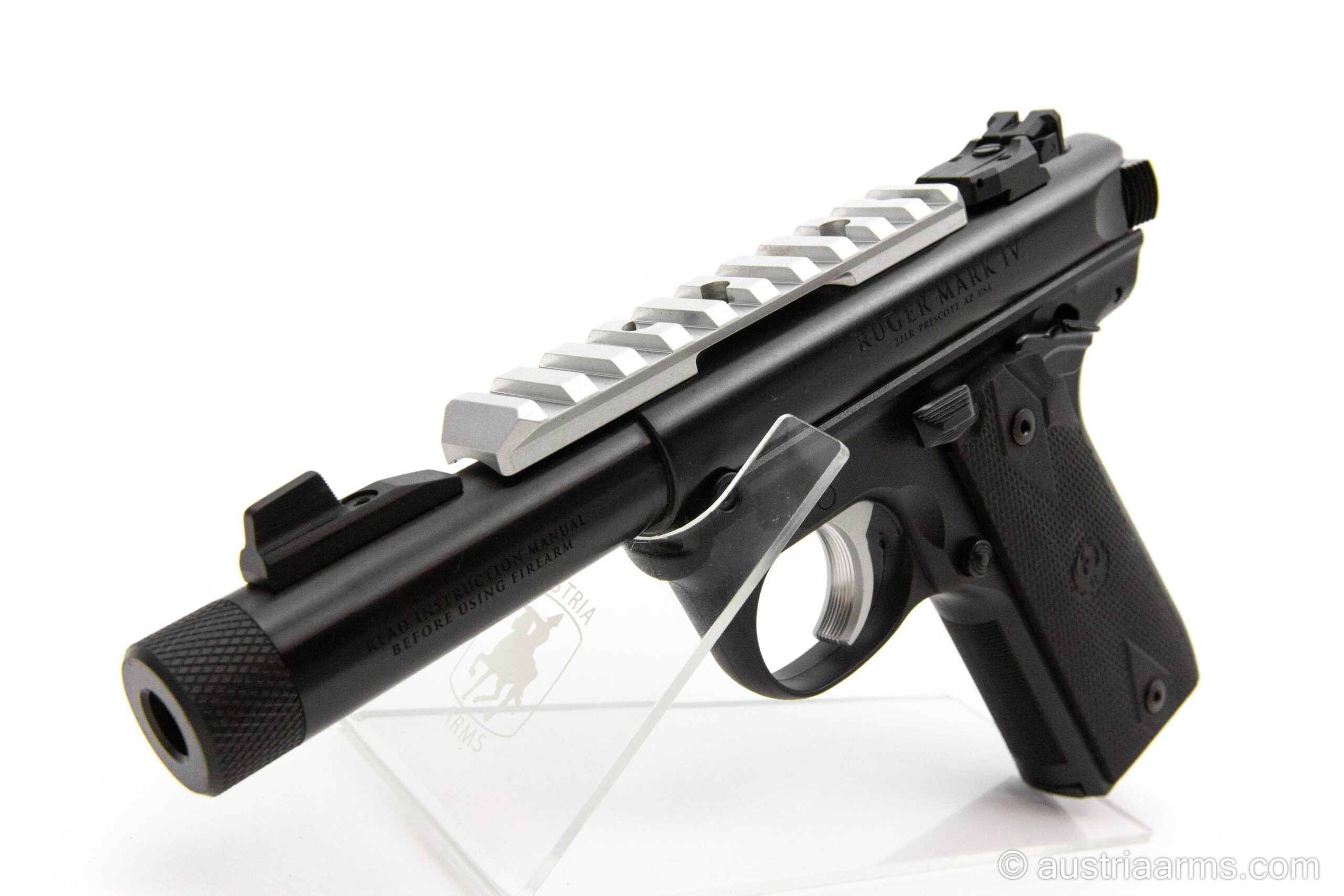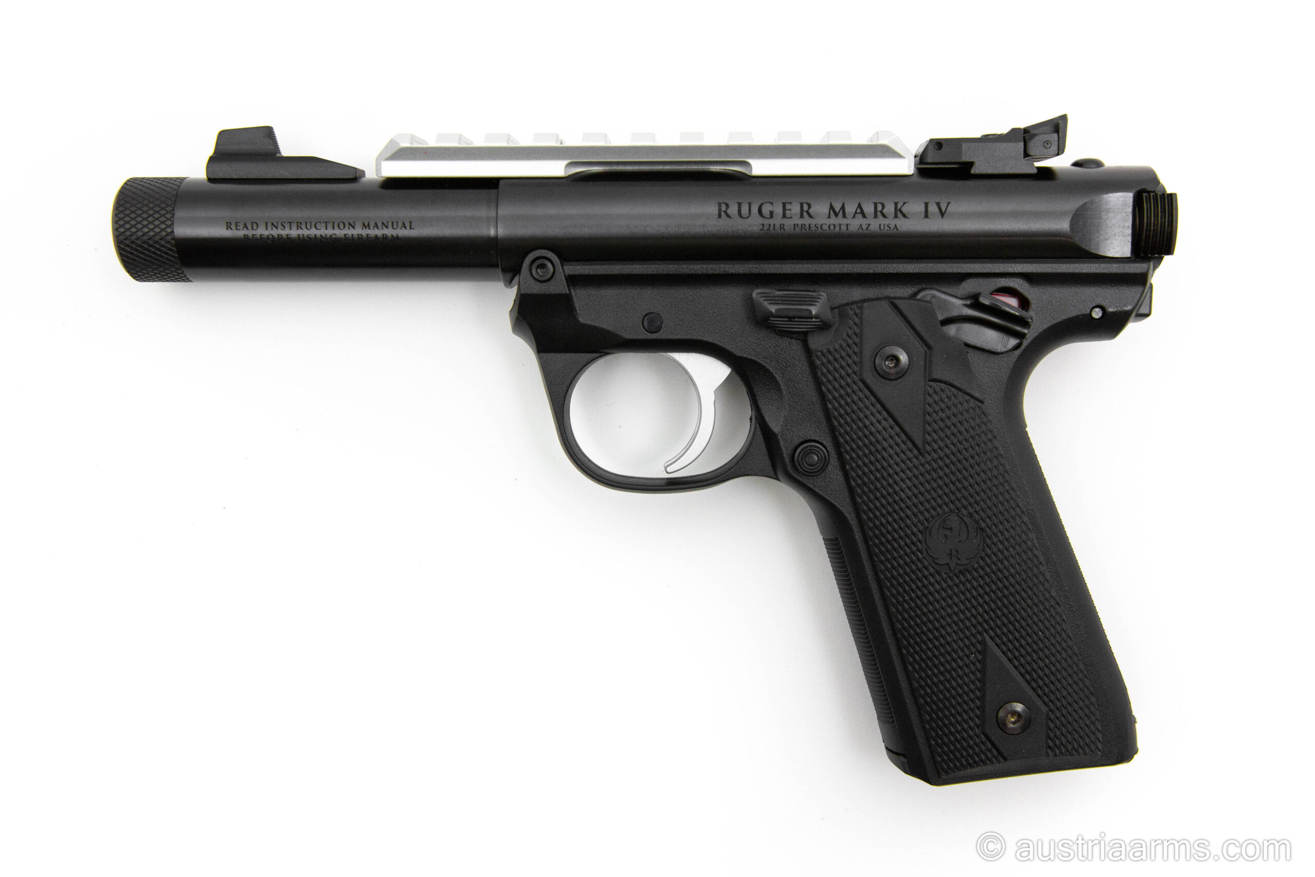 Attraktive Leichtmetallversion der beliebten und ebenso bewährten Ruger Mark IV. Kompakte Lauflänge 4.0 Zoll. Mit Mündungsgewinde für Schalldämpfer, lange, obenliegende Picatinnyschiene zur Montage einer Optik. Zuverlässige und sehr präzise schießende Freizeit- und Sportwaffe im Kaliber .22 LR. Magazinkapazität: 10 Patronen. Sehr einfach zu zerlegende Waffe, daher pflegeleicht.