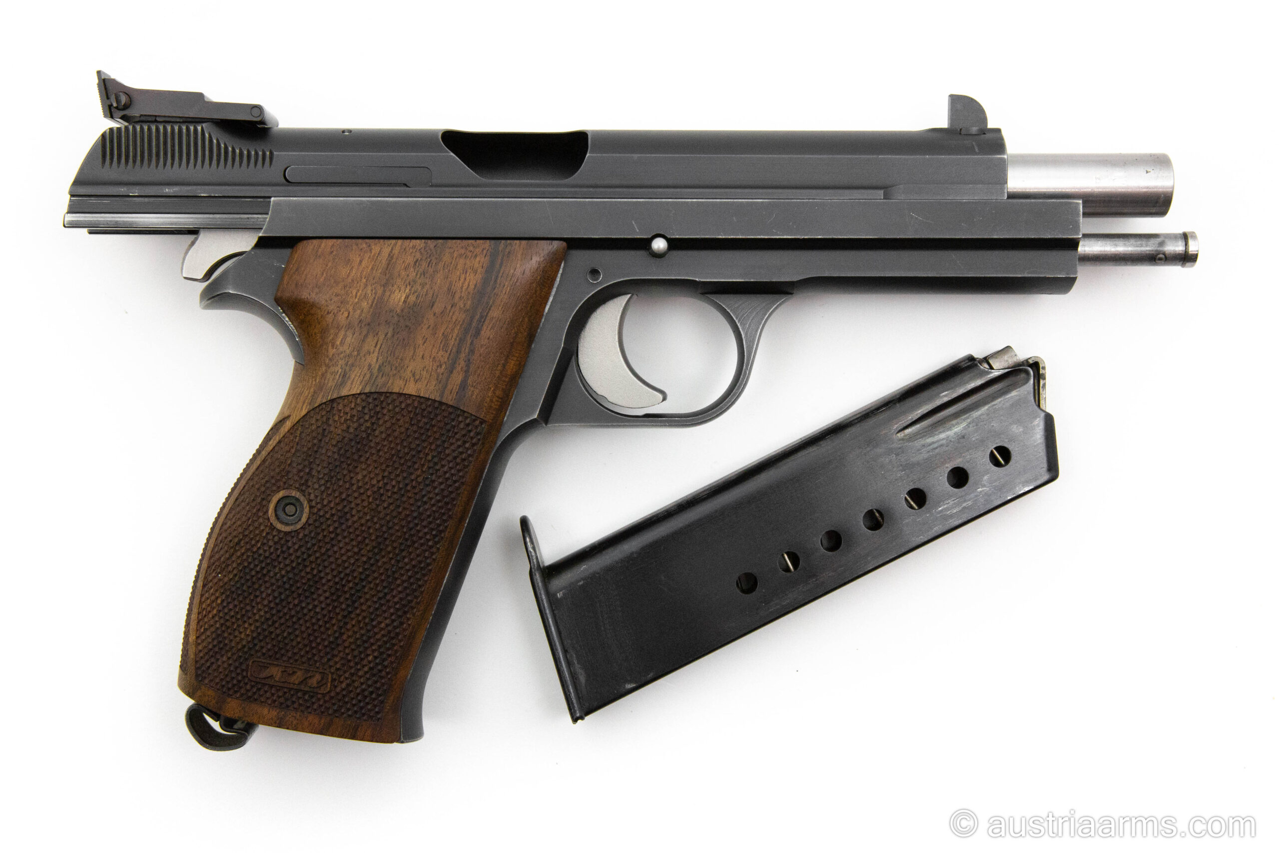 Original Schweizer Fertigung, kaum noch zu bekommen. Komplett in der Originalschachtel mit Anschussbild. Diese SIG P210 wurde zusätzlich mit den eleganten Holzgriffschalen von Karl Nill ausgestattet. Die originalen Schweizer Griffschalen aus schwarzem Kunststoff sind dabei.