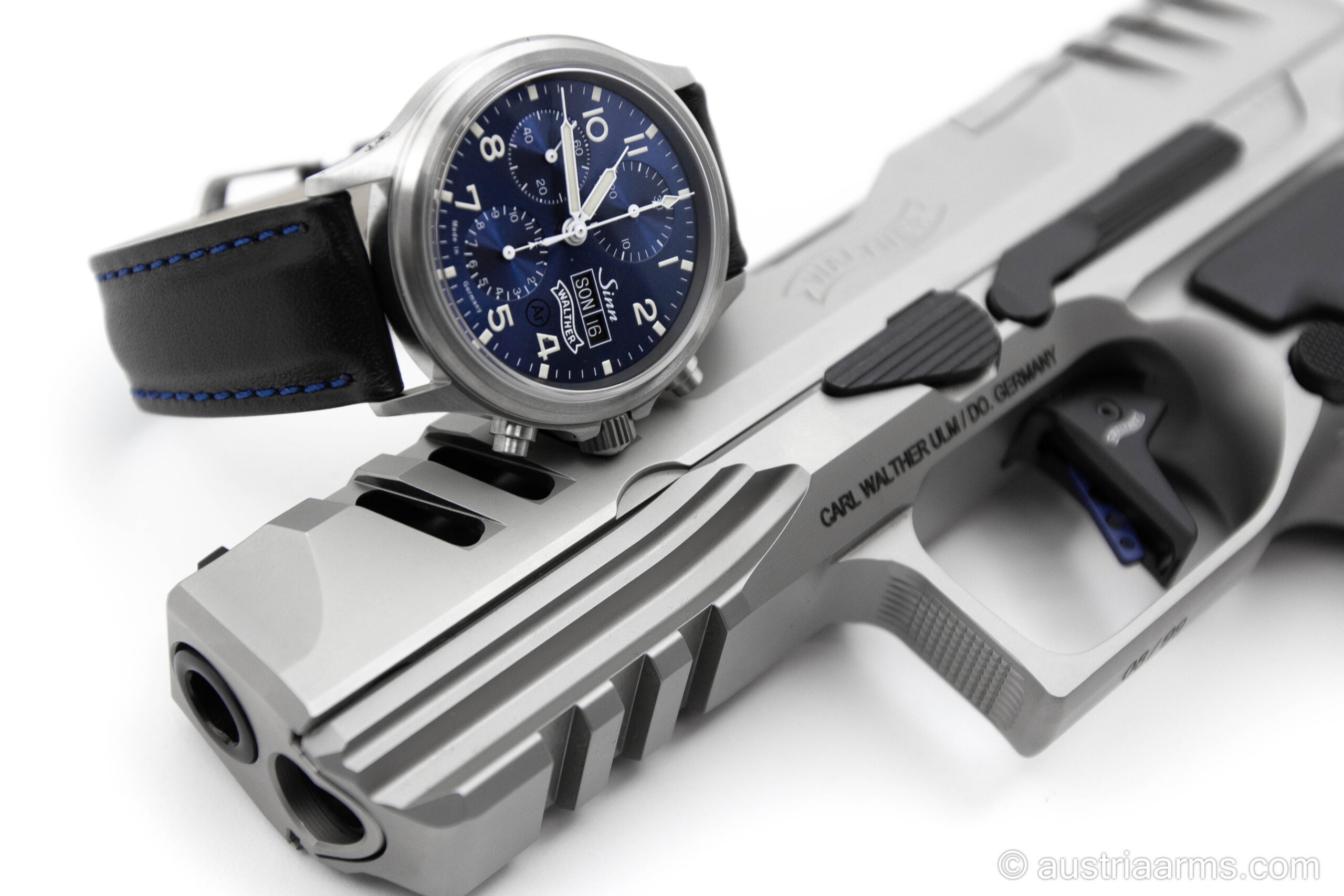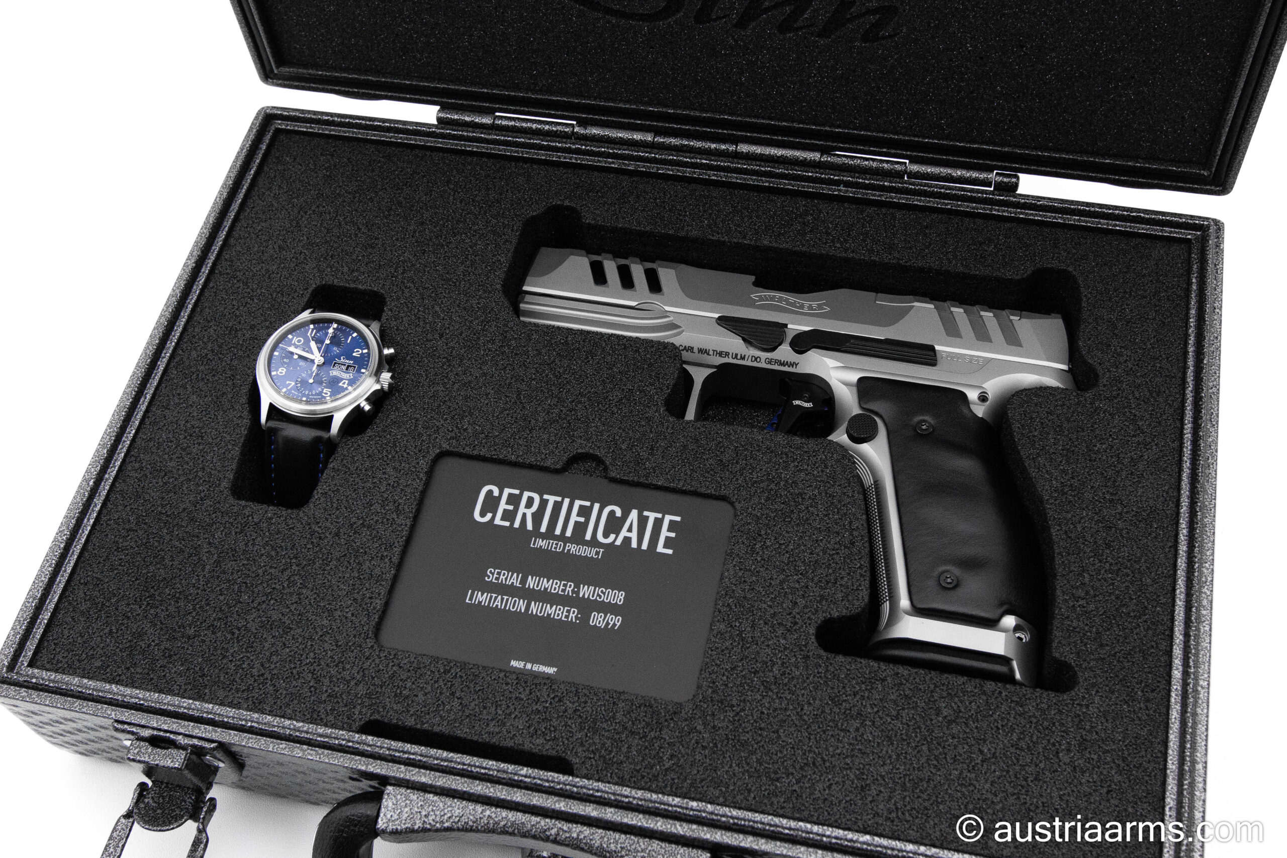 Besonderheiten: Waffennummer und Limitierung auf dem Rotor Blau. Nachleuchtendes Logo der Carl Walther GmbH auf dem Zifferblatt