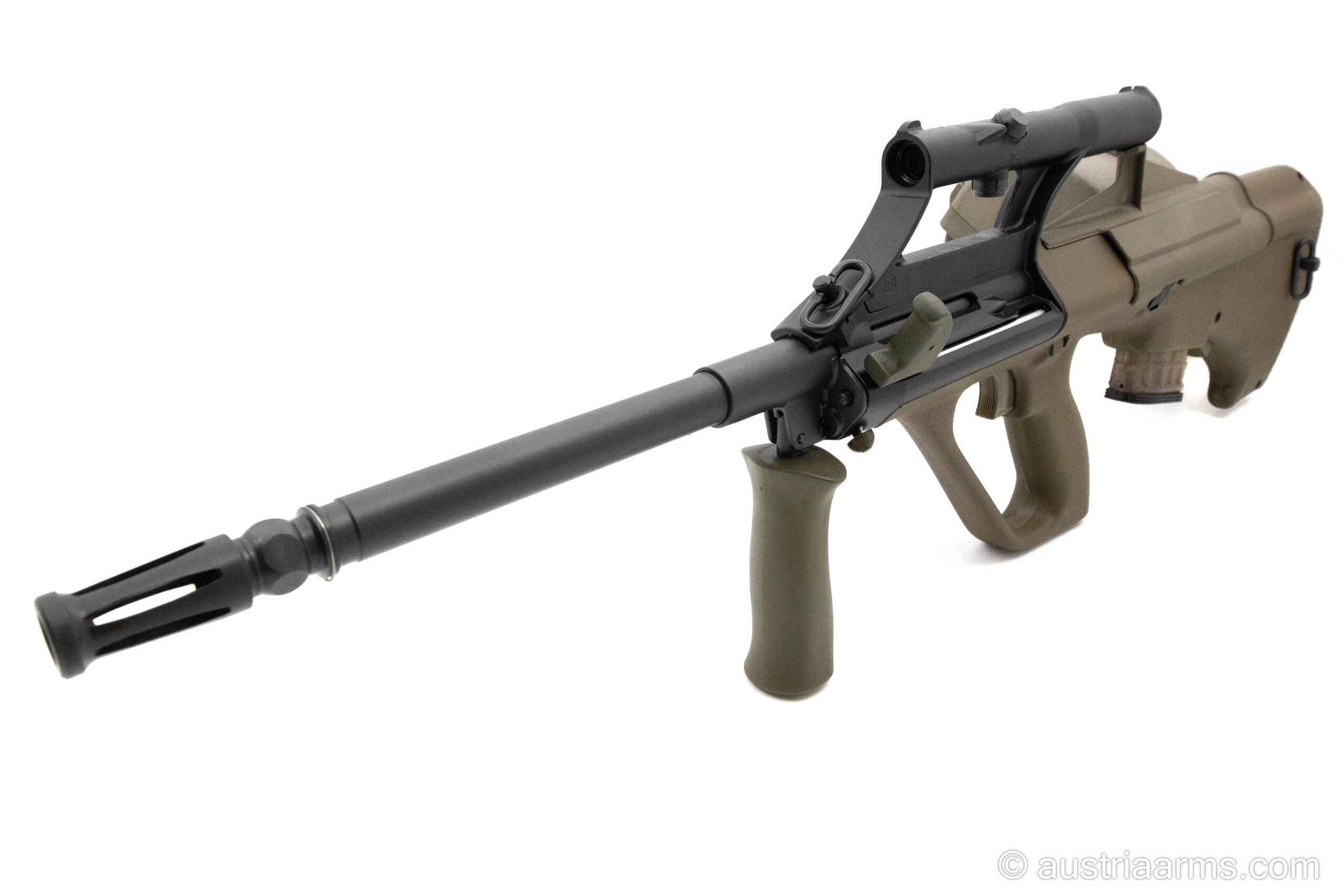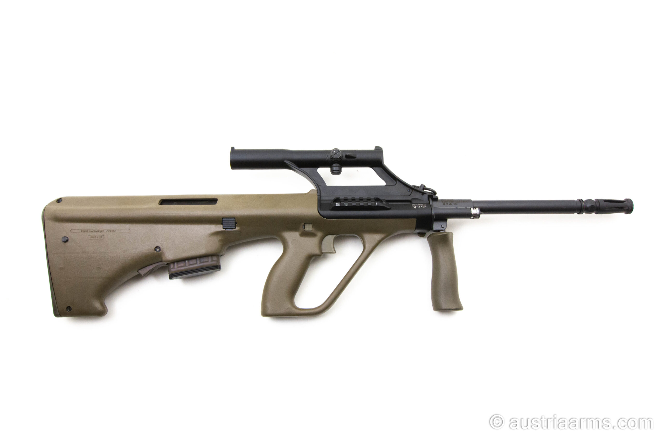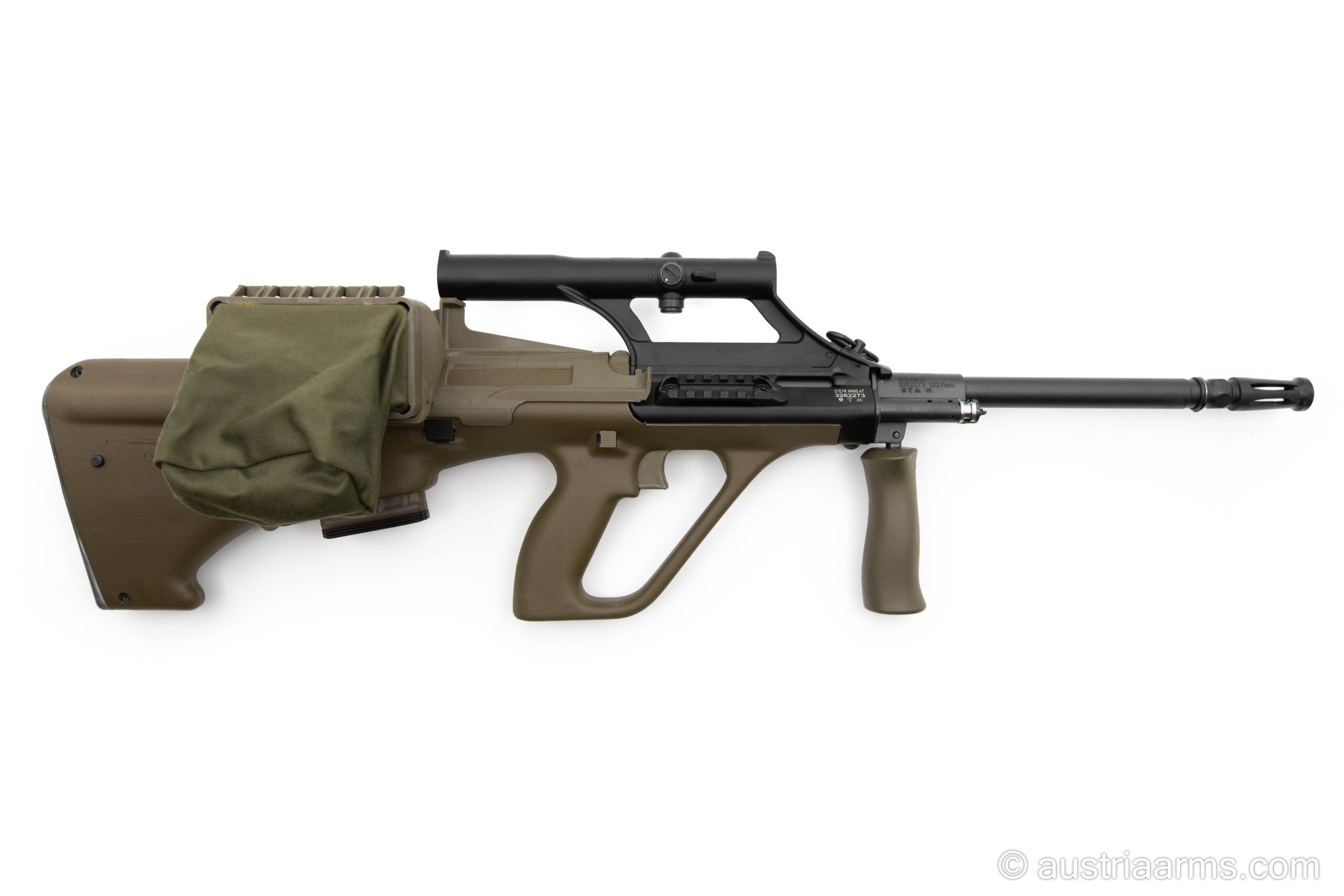 Steyr AUG in seiner ursprünglichen, klassische Version: zivile (halbautomatische) Ausführung des STG77. Magazinkapazität 10 Patronen, Lauflänge 508 mm, Military Olive. Fast so, wie damals.