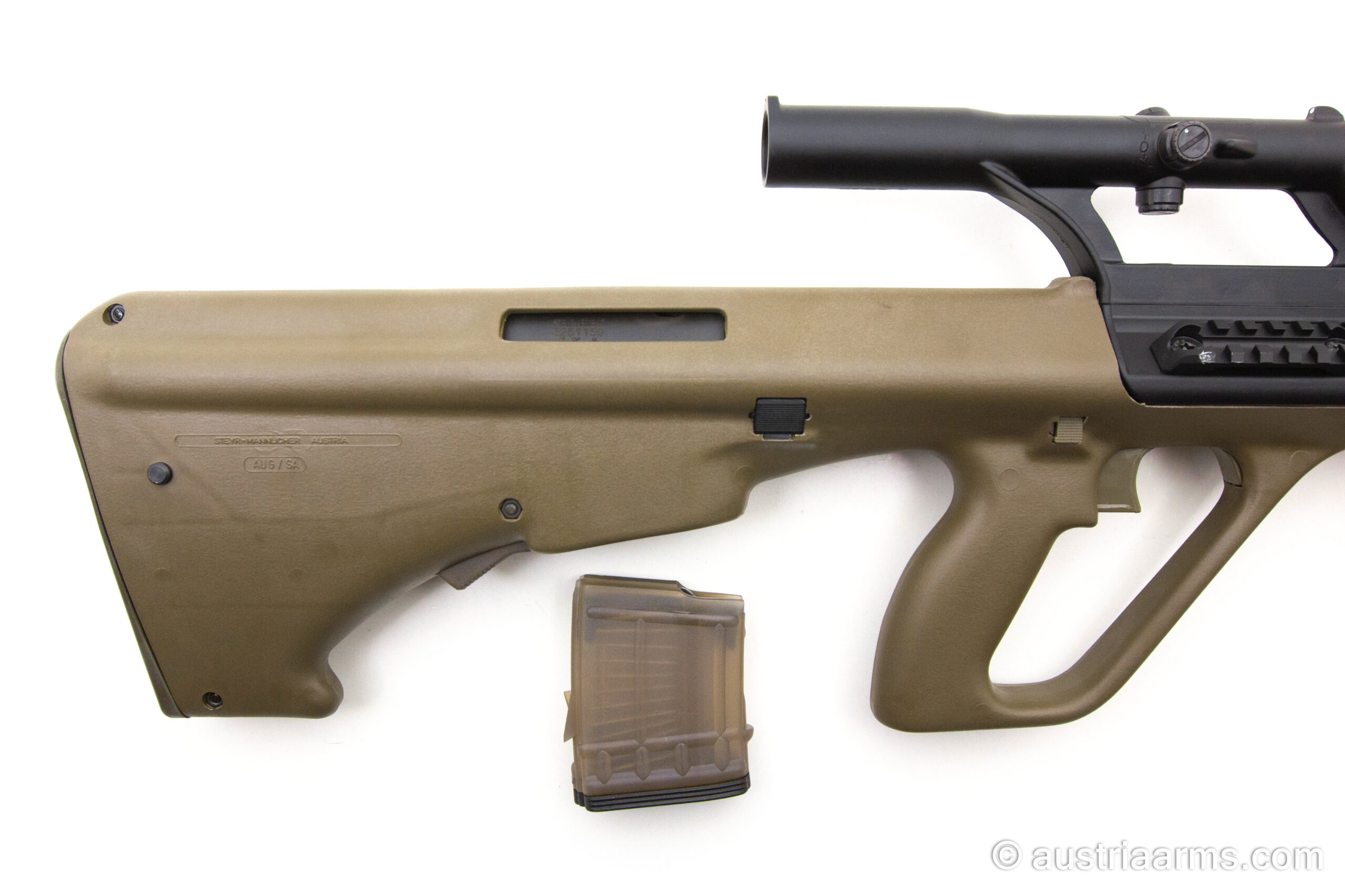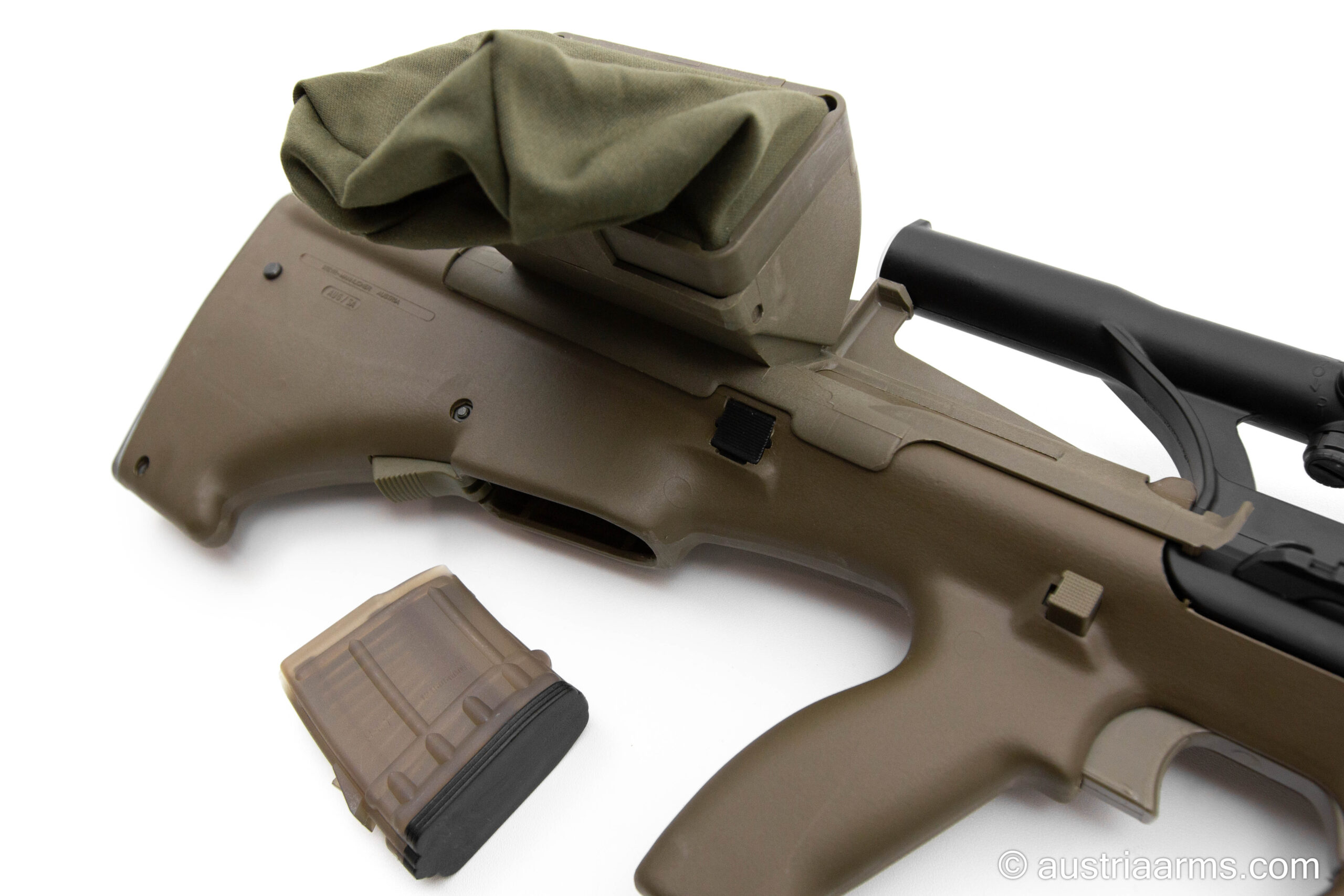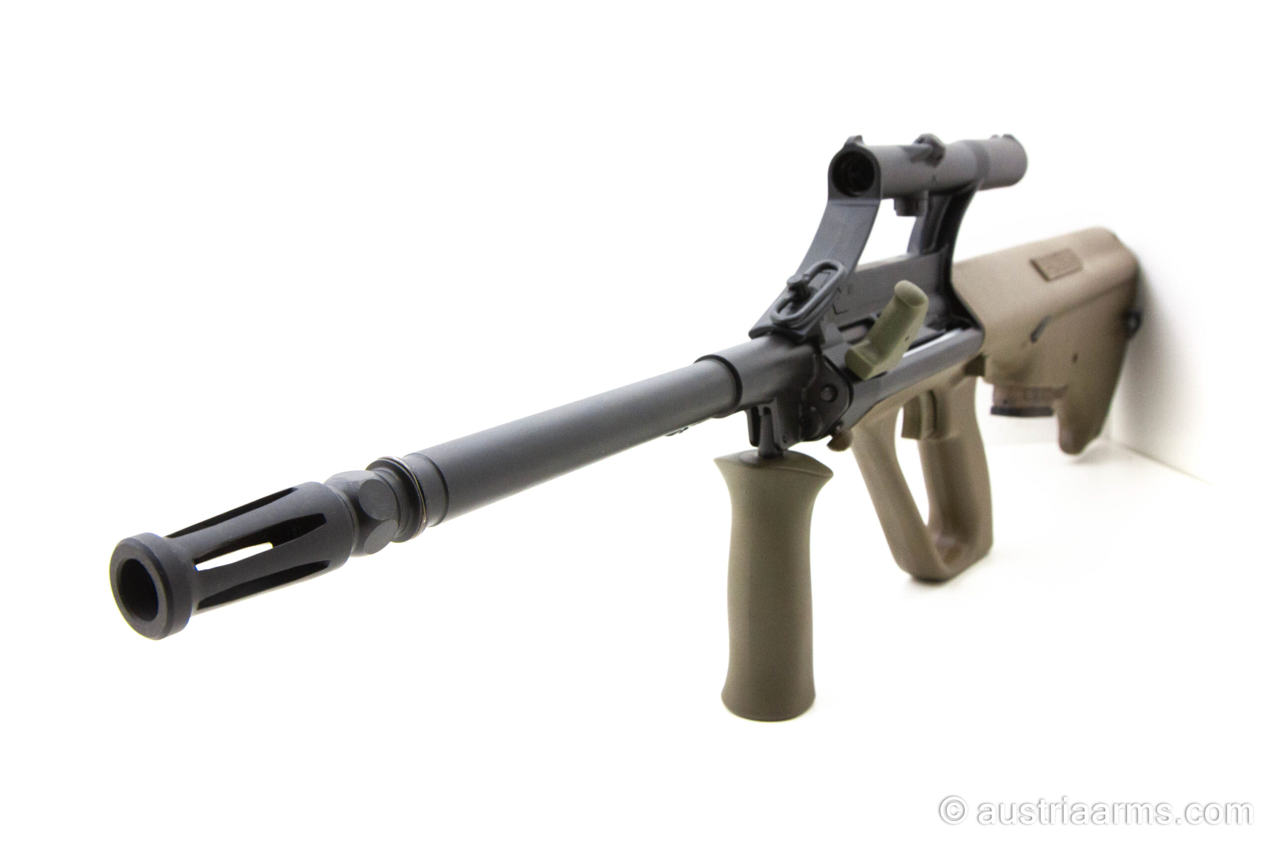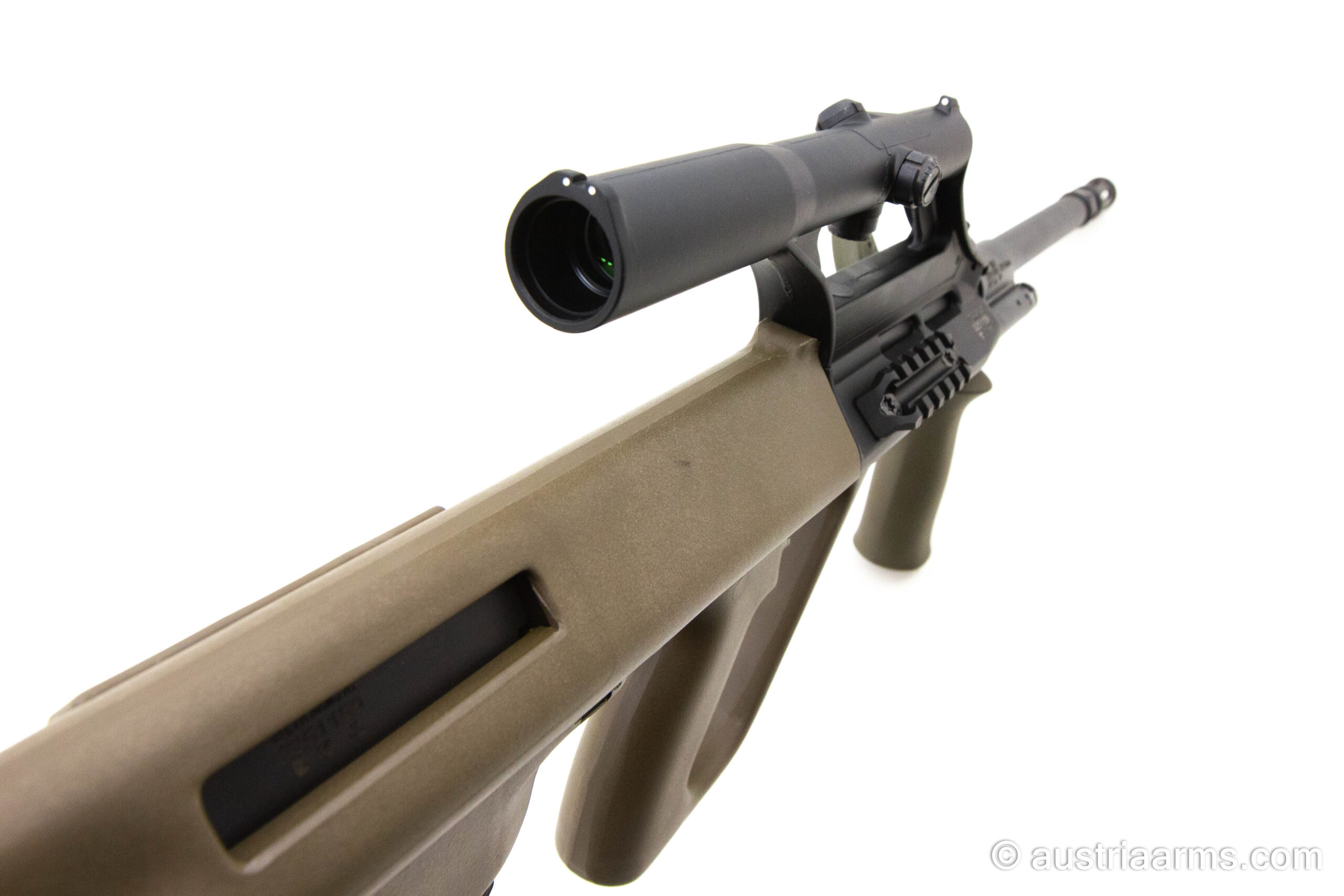 Steyr AUG in seiner ursprünglichen, klassische Version: zivile (halbautomatische) Ausführung des STG77. Magazinkapazität 10 Patronen, Lauflänge 508 mm, Military Olive. Fast so, wie damals.