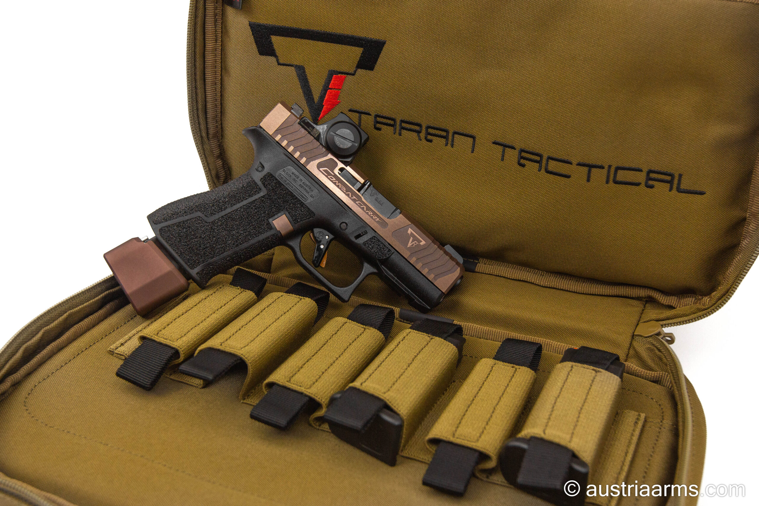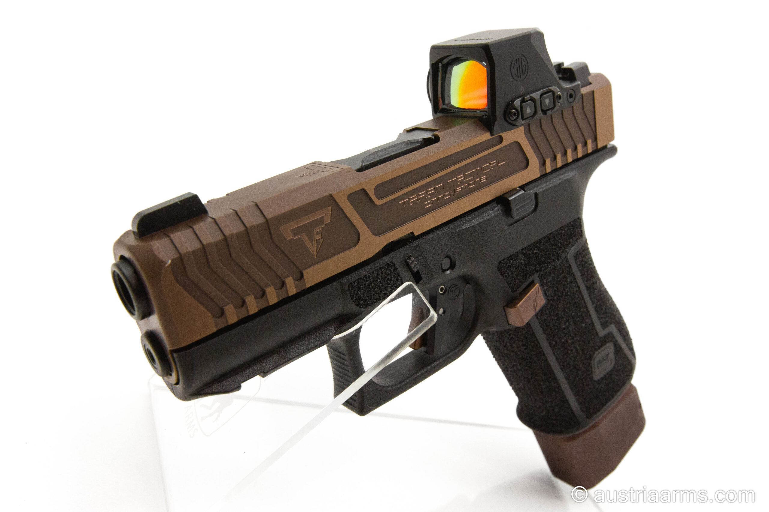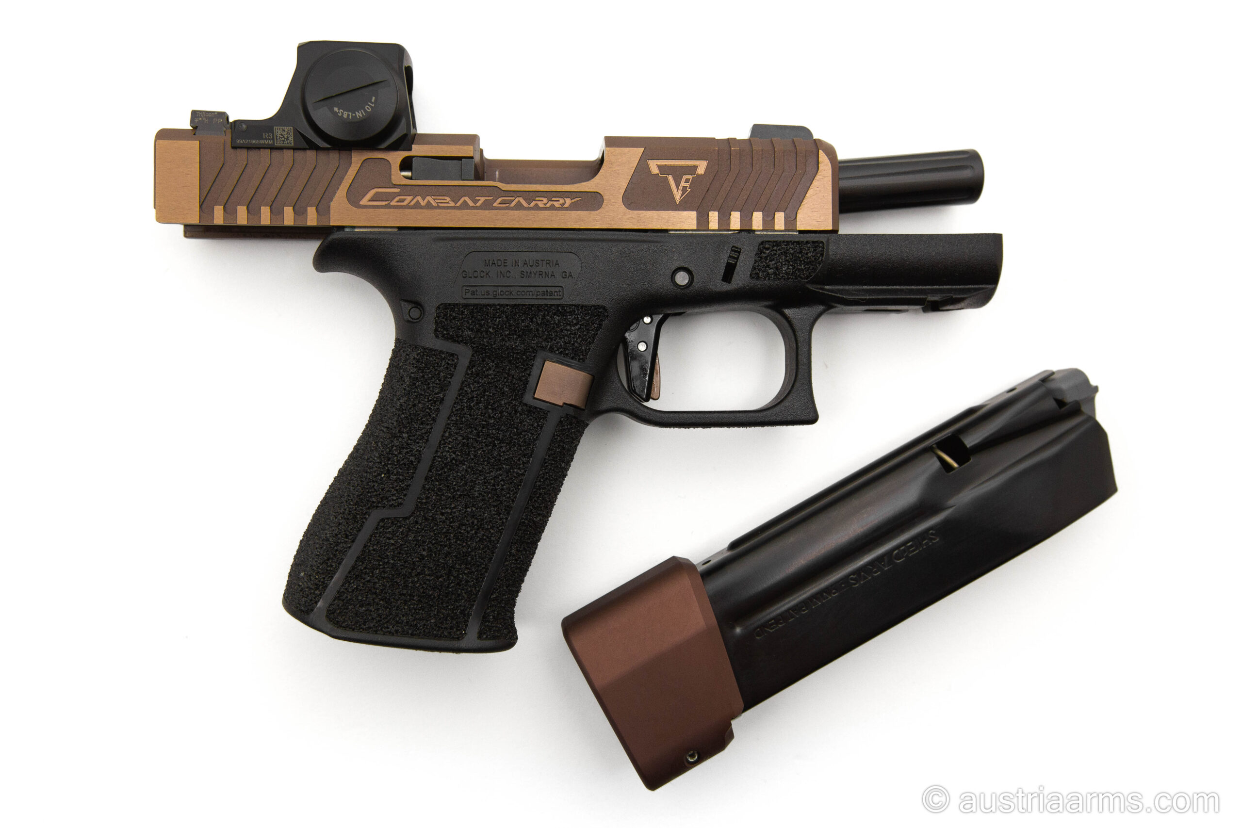 Auf Basis einer Glock 43X wurde von der Customschmiede des US Weltklasseschützen und Hollywood-Ausstatters Taran Butler („John Wick“ etc..) die G43X Combat Carry Copper Head geschaffen. Dies ist mehr als eine Waffe, es ist ein technisches Kunstwerk. Die Zuverlässigkeit einer Glock Pistole wurde mit technoider Ästhetik vereint. Die TTI G43X Combat Carry Copper Head wird ihrem Besitzer lebenslange Freude machen. Waffen von Taran Butler sind auf dem Markt kaum zu bekommen. Wir haben lange darauf gewartet, endlich ist dieses Meisterwerk bei Austria Arms sofort zu haben.