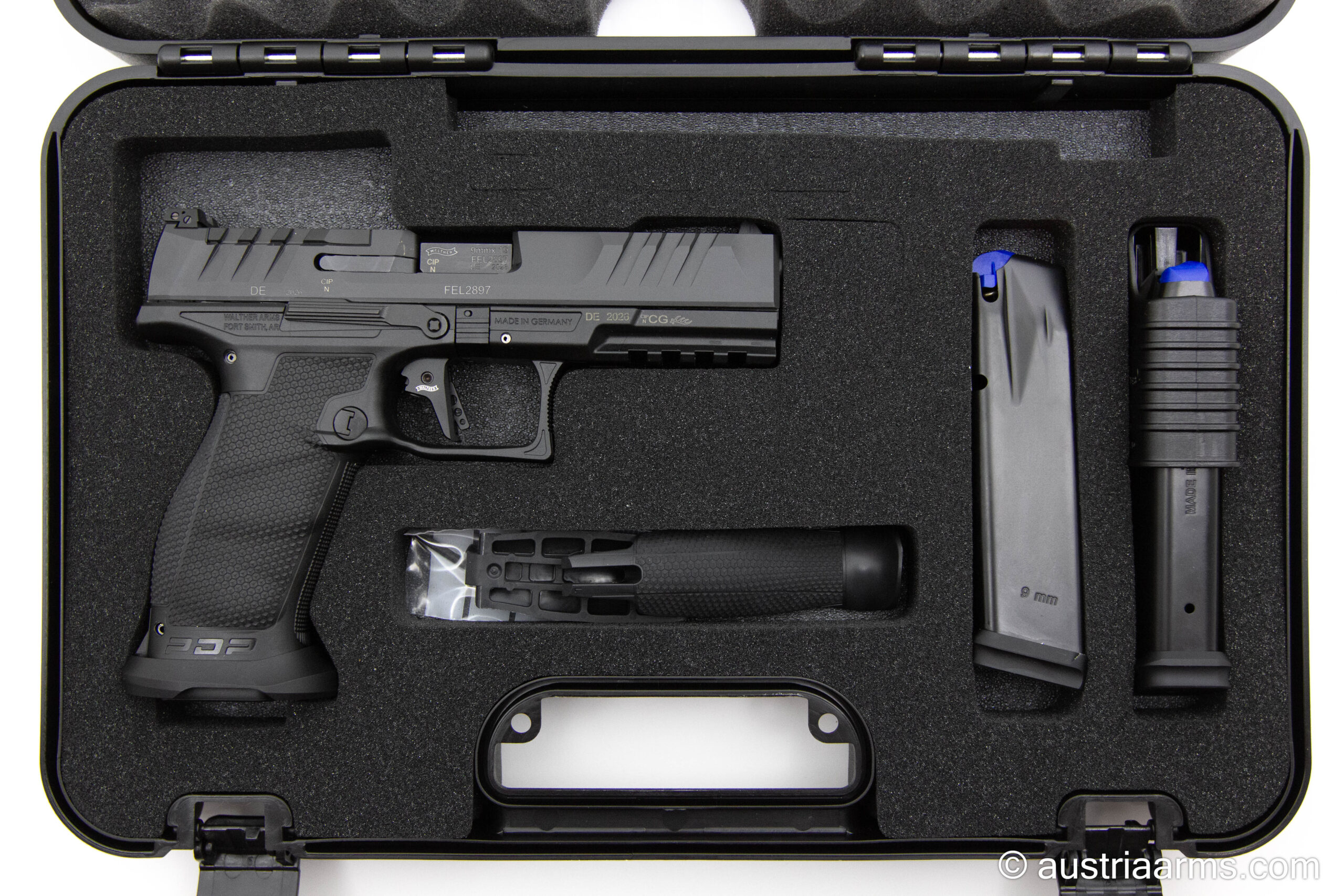 Neuwaffe im Originalkoffer mit zwei Reservemagazinen.