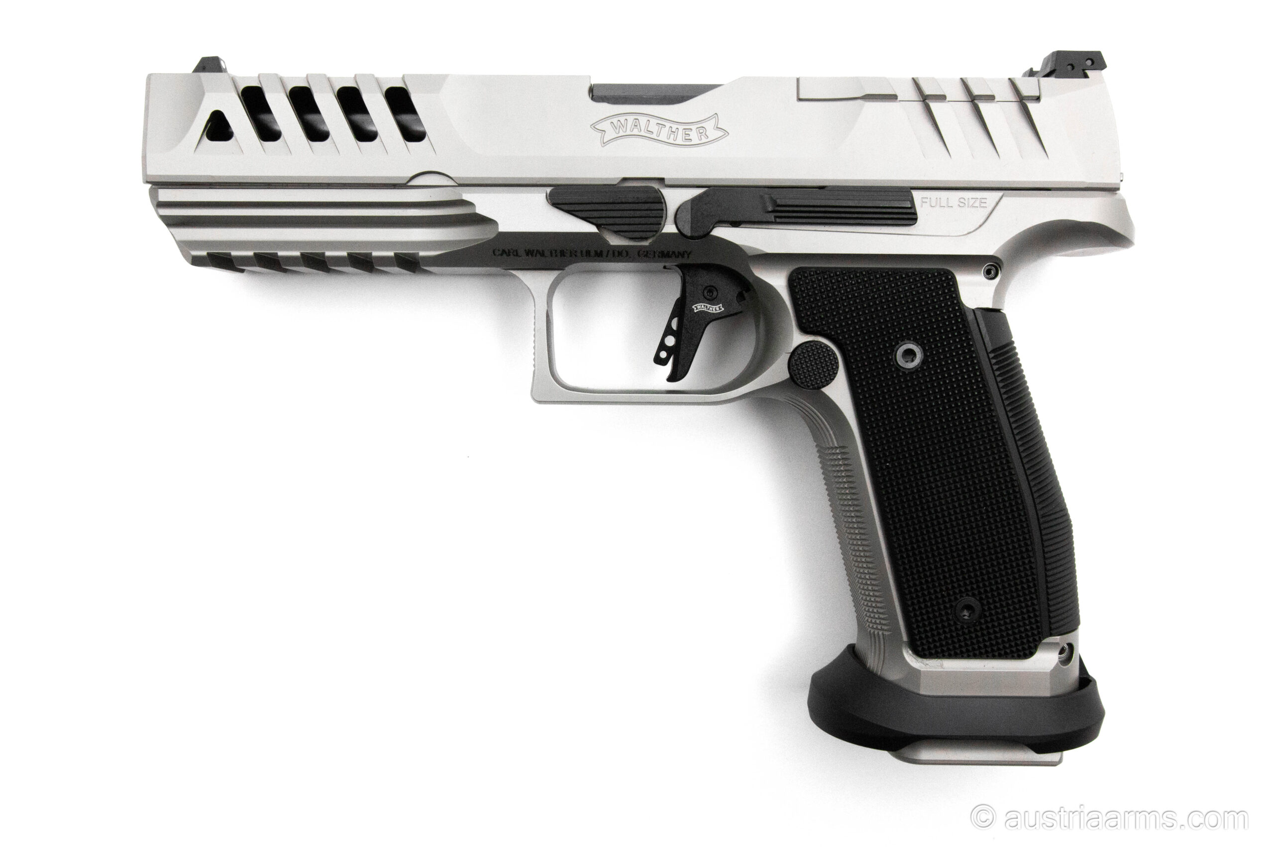 Die PDP Match Steel Frame vereint alle Top-Features der PDP-Familie in einer High-Performance Wettkampfwaffe. Der Dynamic Performance Trigger setzt selbst für Walther mit seiner langen Historie von Abzügen neue Standards. Skelettierte Durchladerillen an der Mündung sorgen für das rasche Abkühlen des Laufs und reduzieren das Gewicht – zugleich verleihen sie der Waffe das dynamische Aussehen eines Supersportlers. Magazinböden aus Aluminium und der Leichtmetall-Magwell bilden die ideale Symbiose aus Klasse, Belastbarkeit und Effizienz. Der primäre Anwendernutzen ist das reibungslose Nachladen in der Bewegung.
