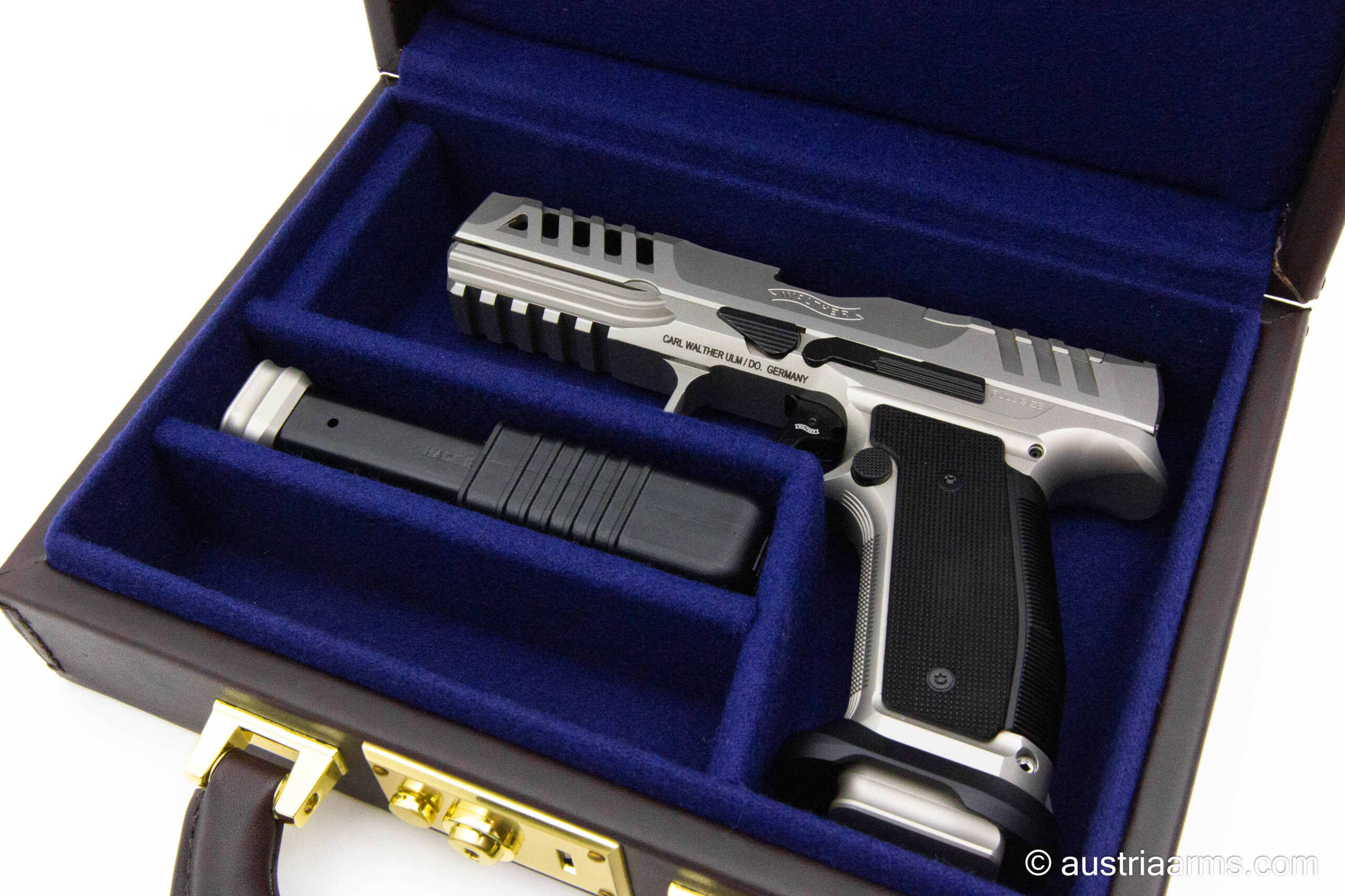 Die Walther PDP Steel Frame wird als Premium Modell „Black Tie“ in elegant-mattsilbernem Finish in einem edlen Lederkoffer ausgeliefert.
