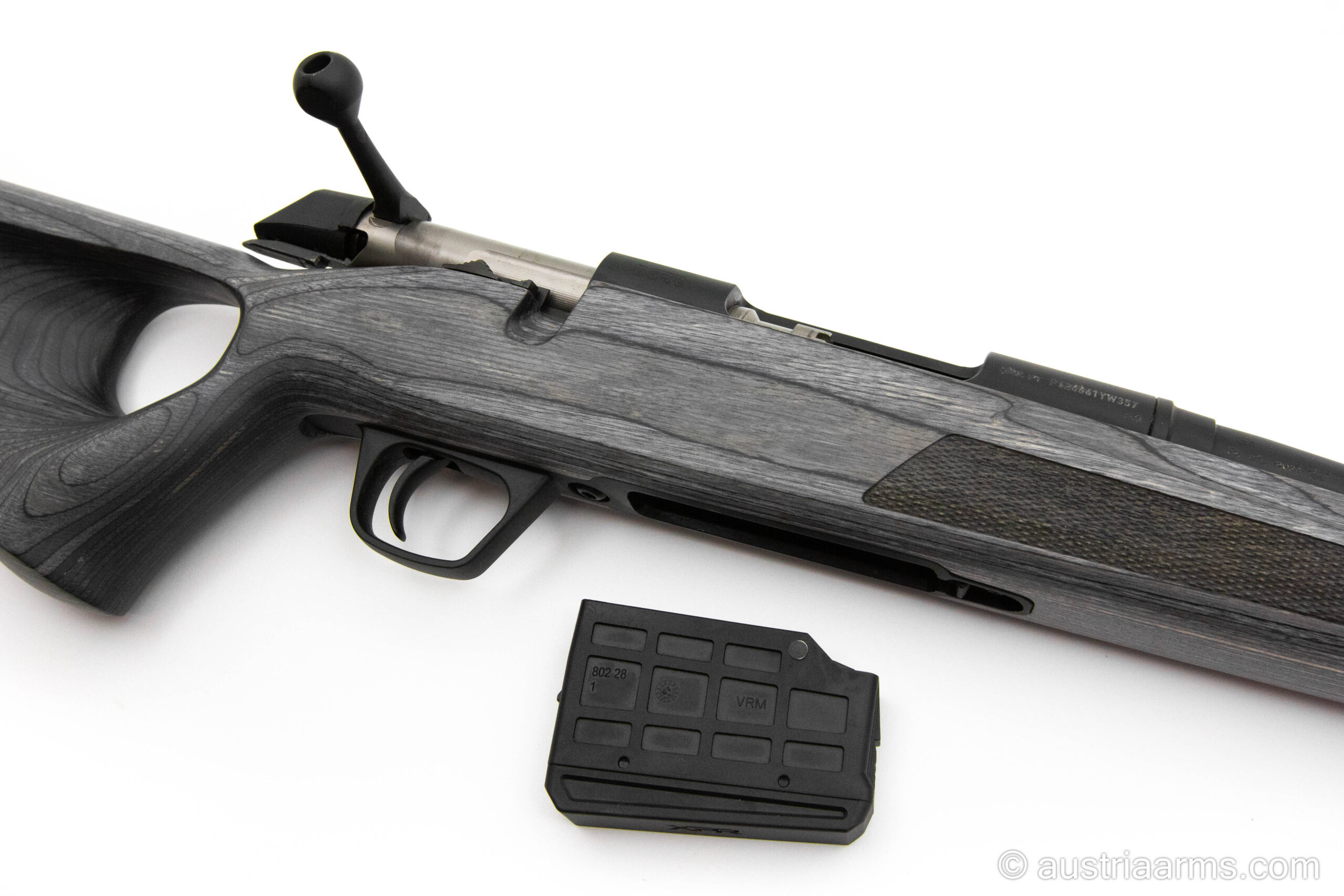 - Schaft: Grauer Schichtholzschaft mit ergonomischem Daumenloch